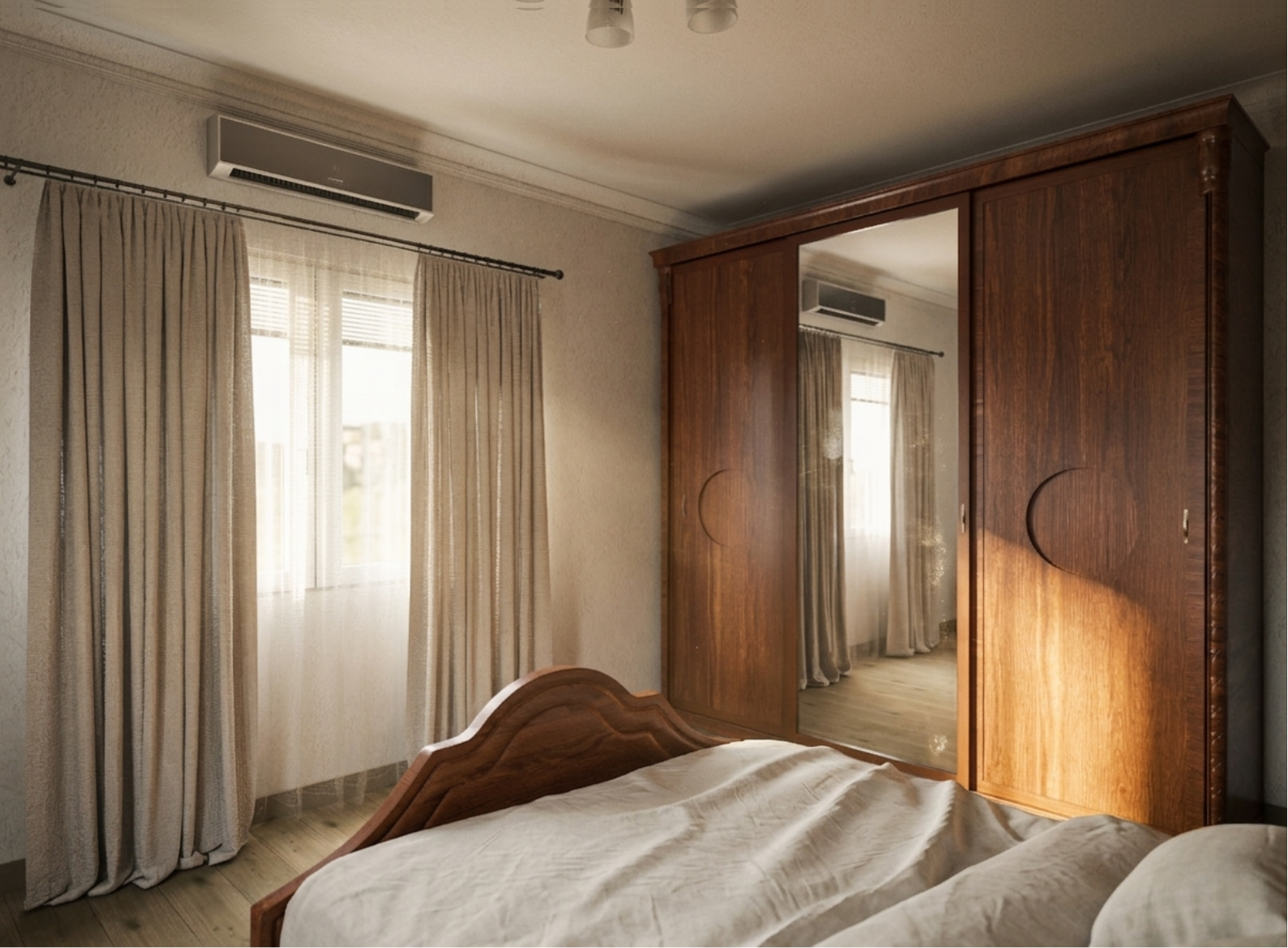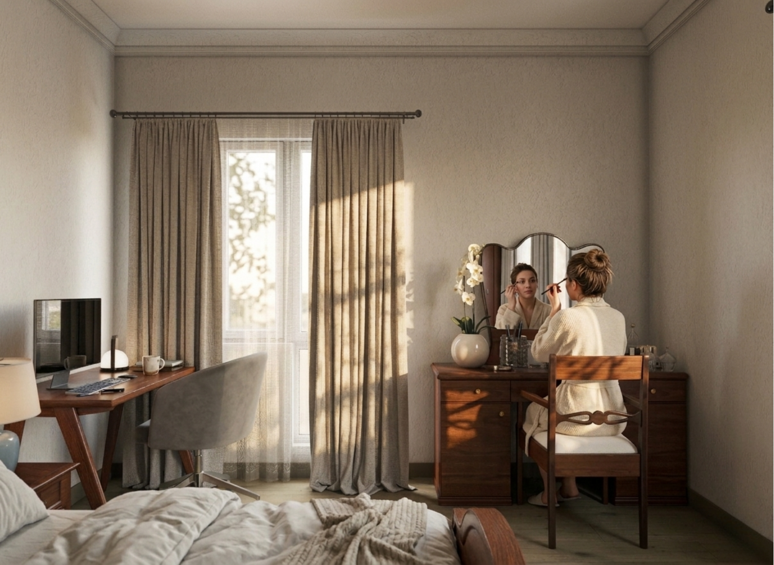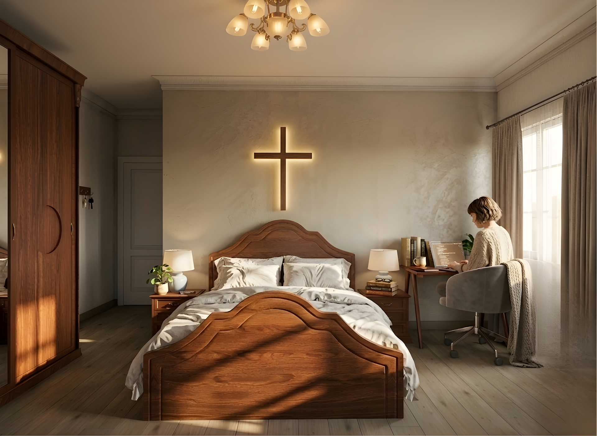 A quiet corner of comfort and reflection — where warm wood, soft light, and a simple cross create a peaceful space to rest, think, and recharge.