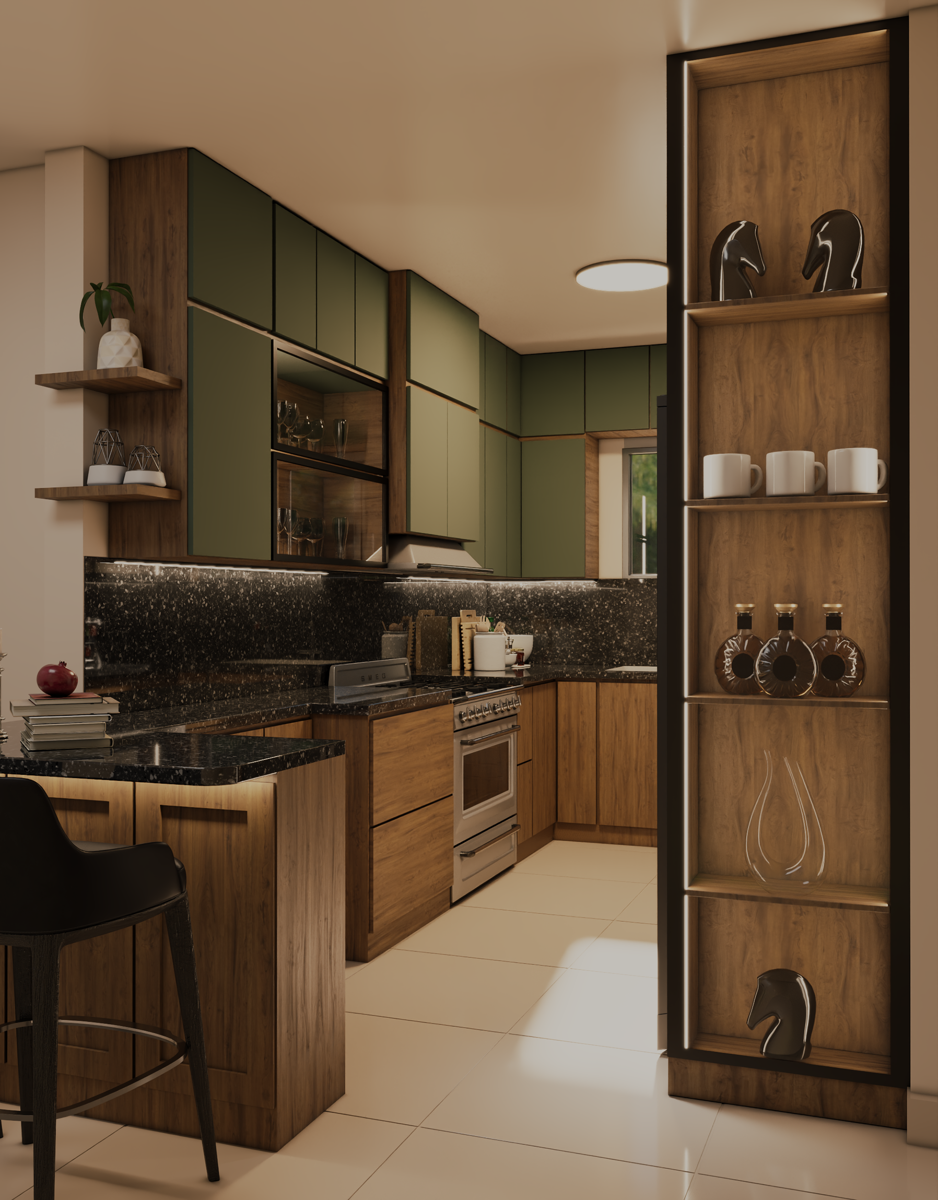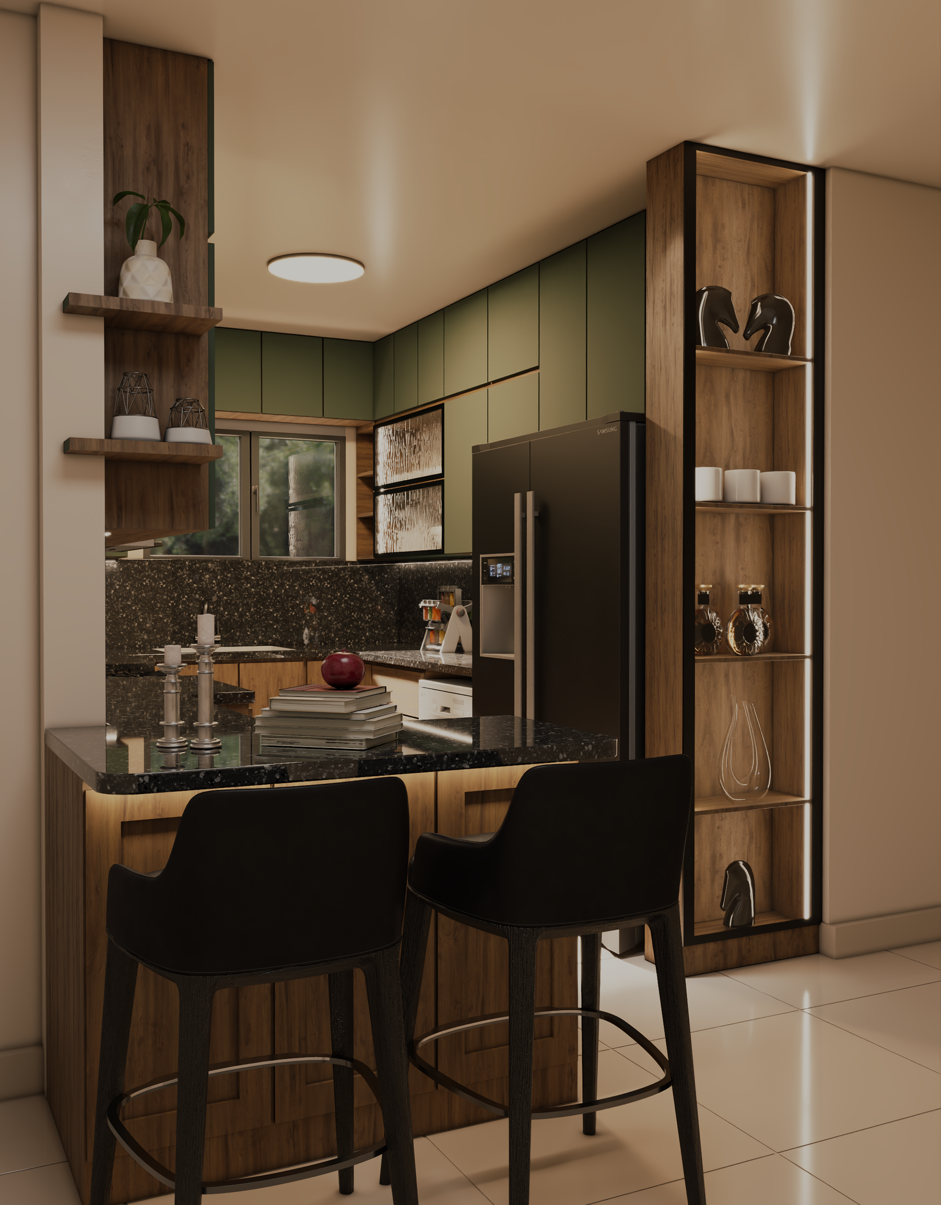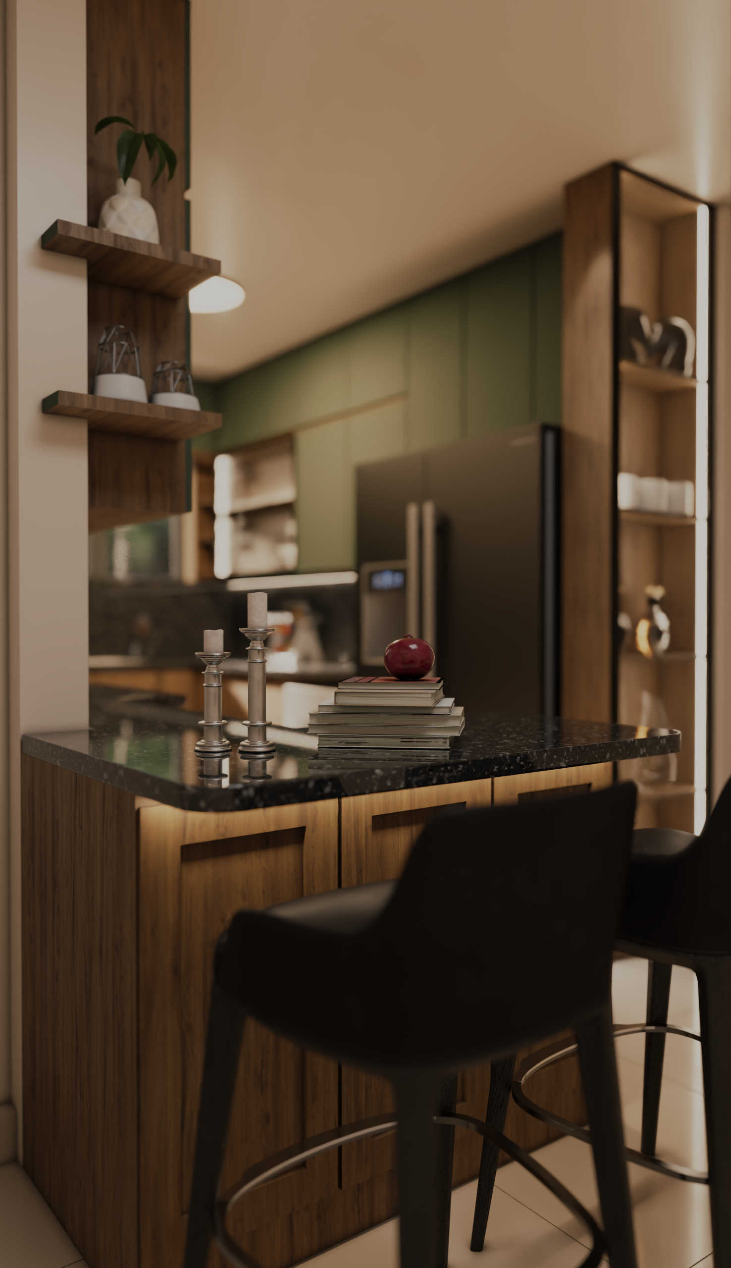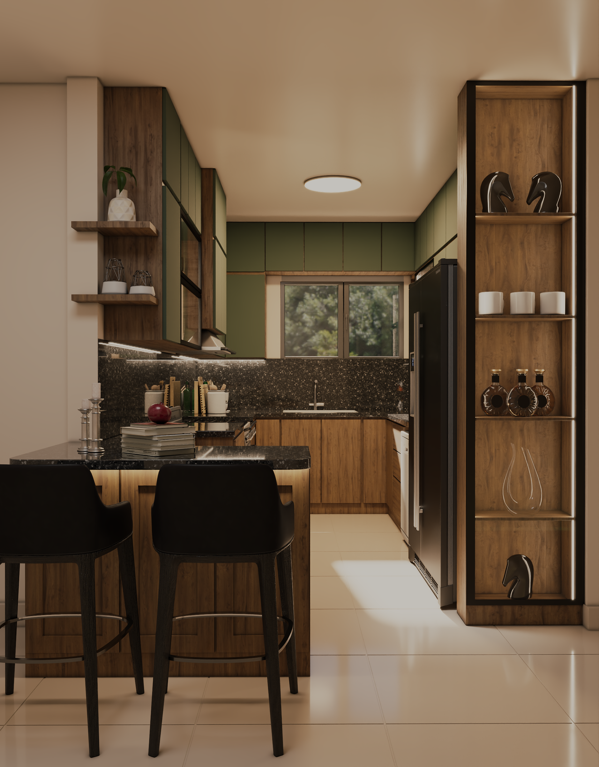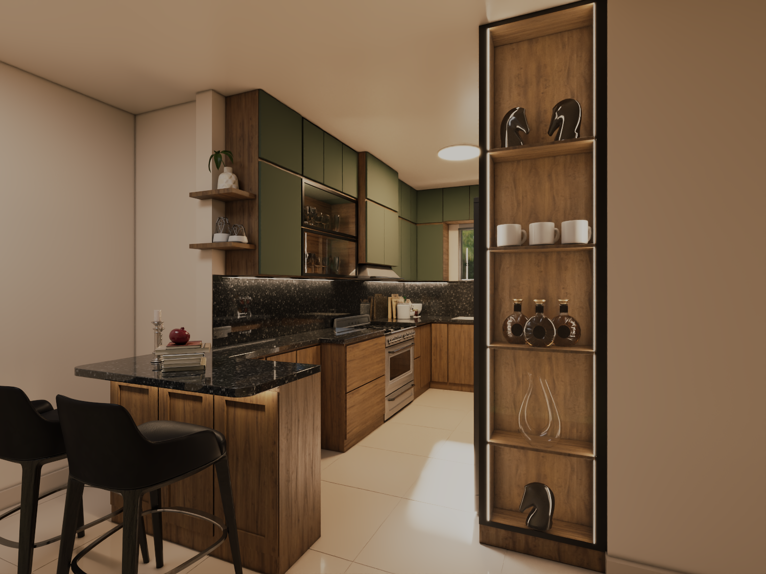 This modern kitchen blends natural wood textures with muted green cabinetry to create a warm yet contemporary atmosphere. A sleek black stone countertop adds contrast and sophistication, while integrated lighting enhances depth and highlights clean lines. Open shelving and a compact island provide both functionality and visual balance, resulting in a kitchen that feels elegant, practical, and inviting.