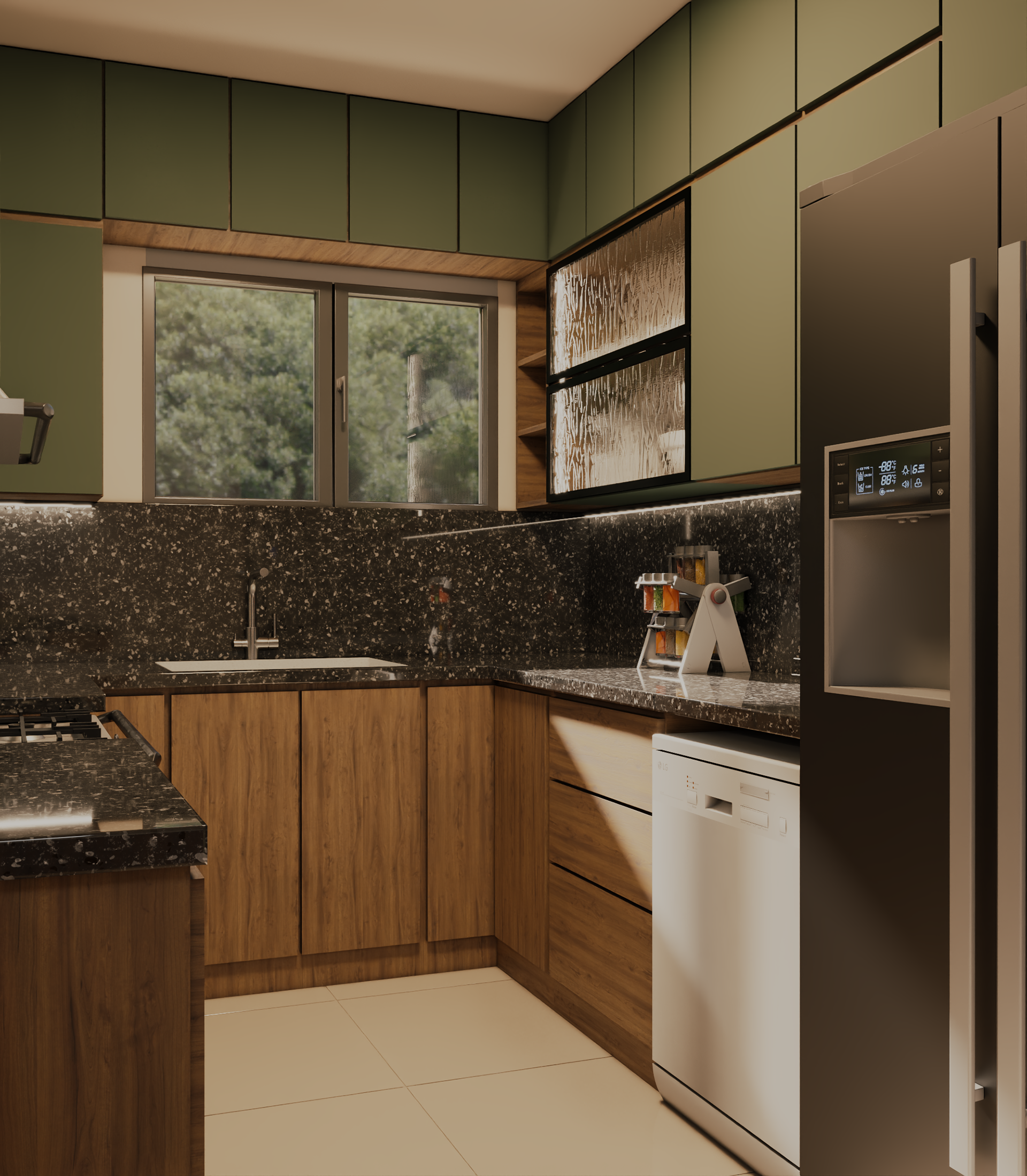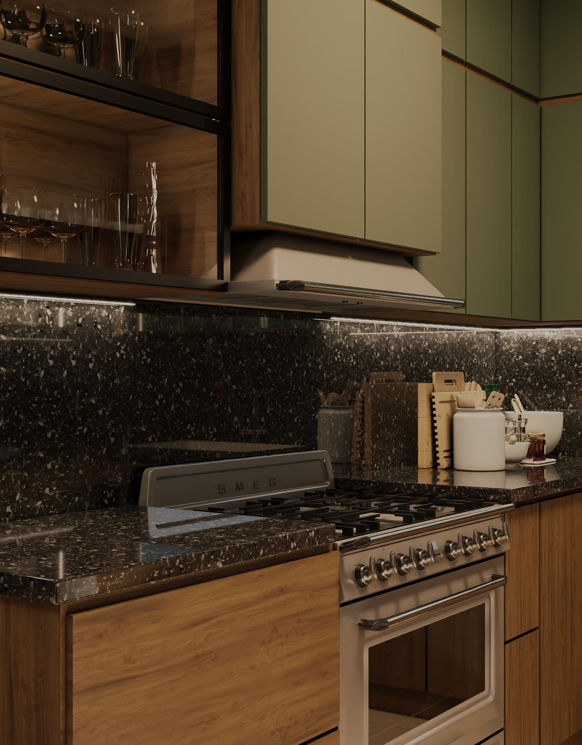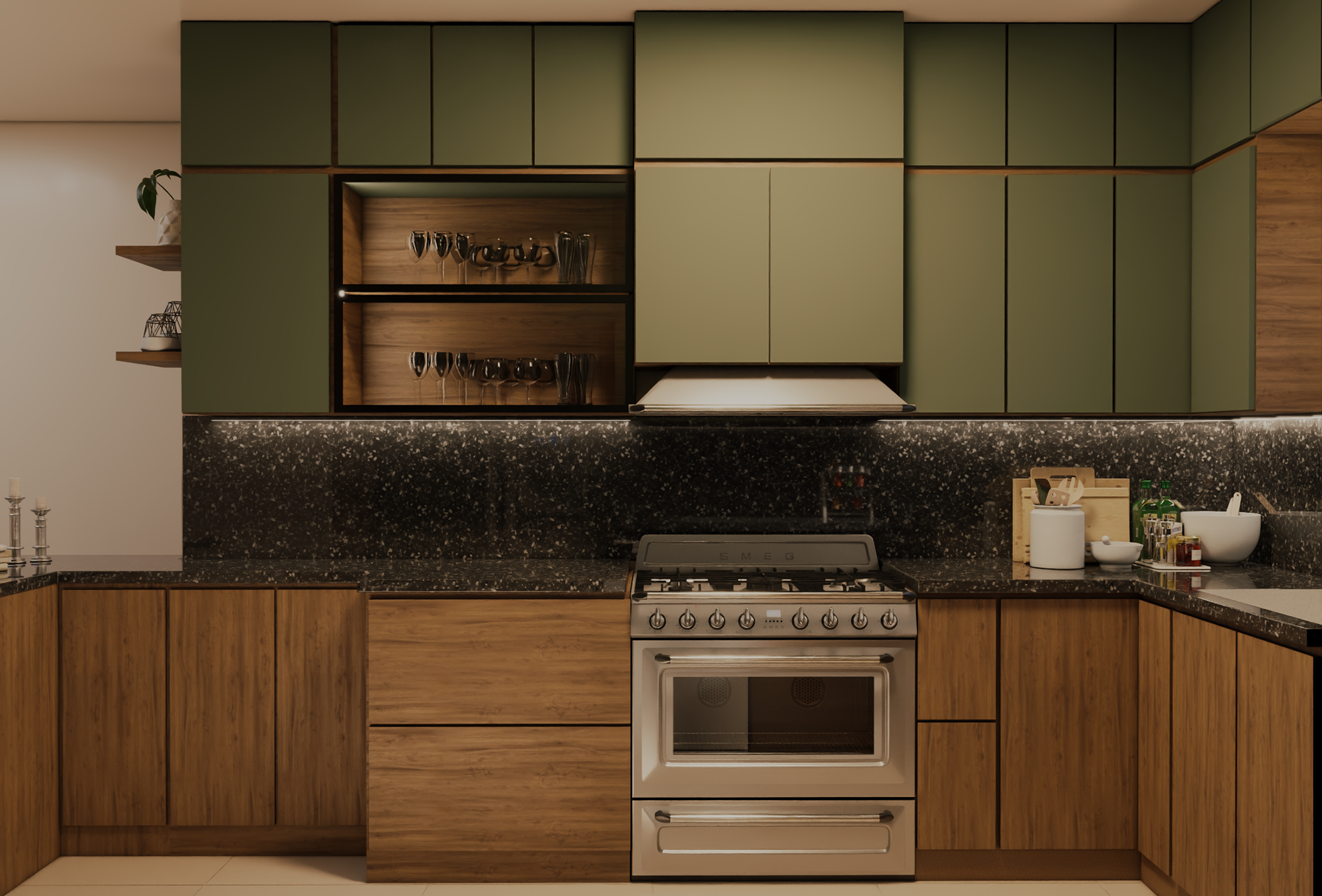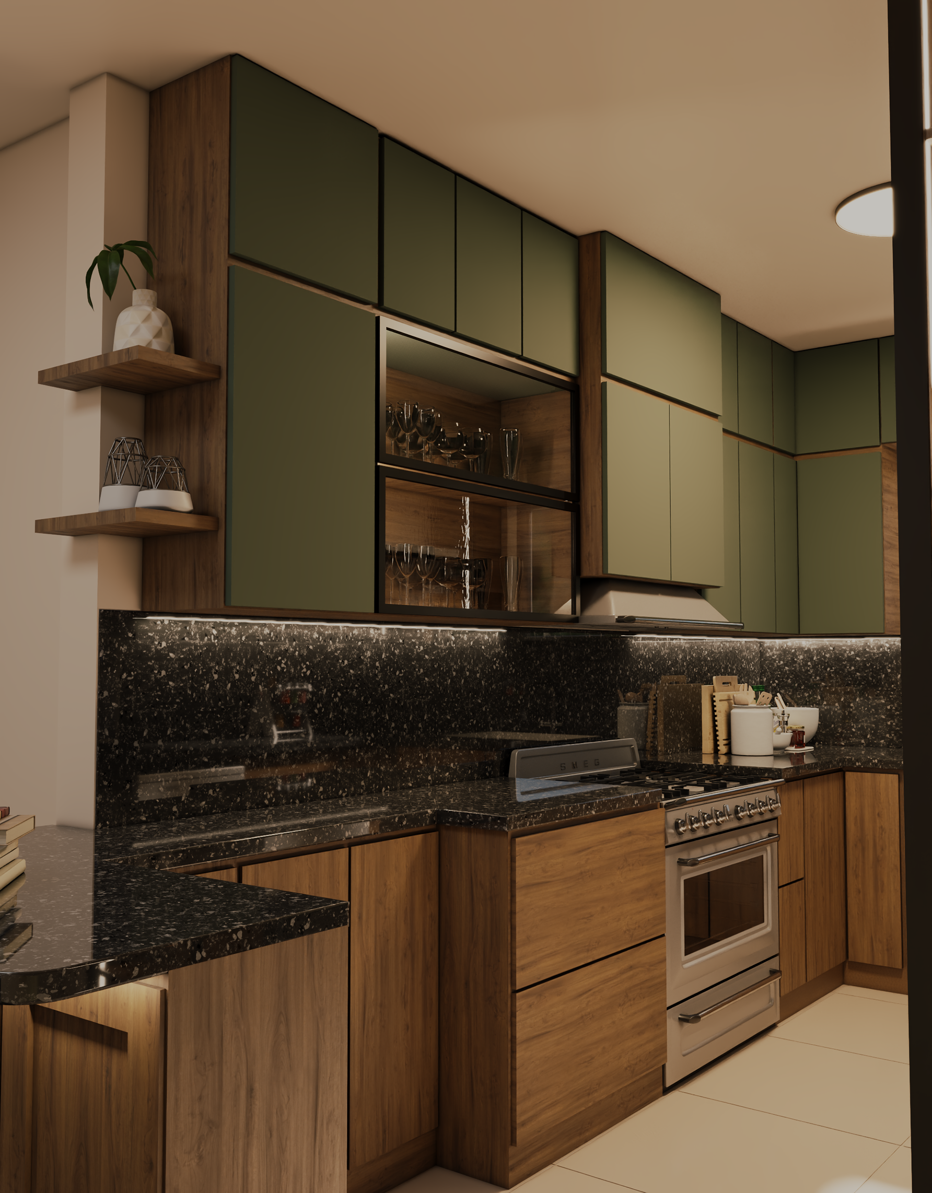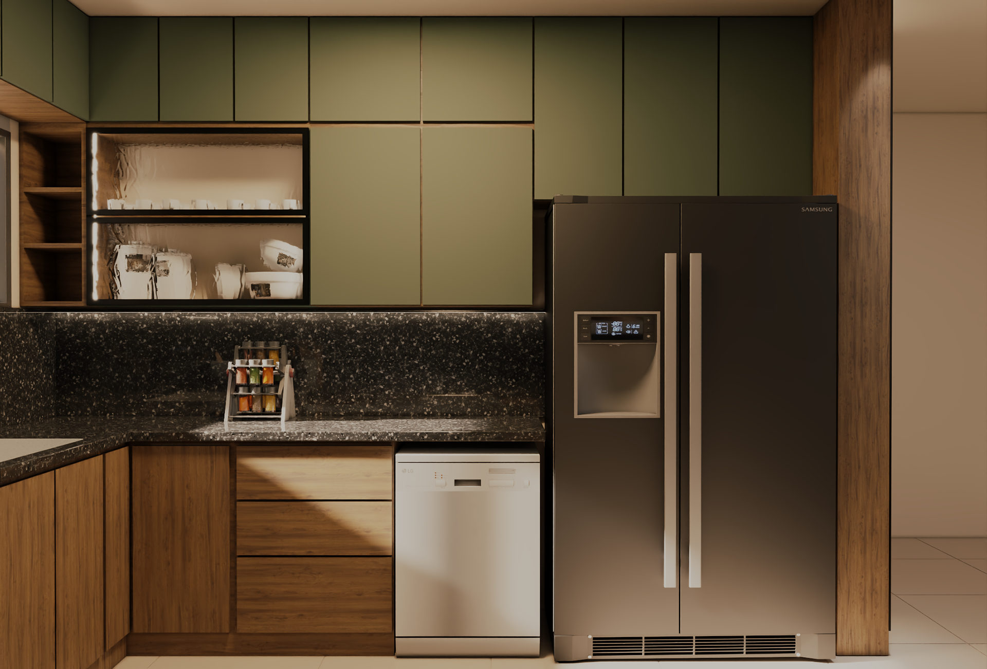 This modern kitchen blends natural wood textures with muted green cabinetry to create a warm yet contemporary atmosphere. A sleek black stone countertop adds contrast and sophistication, while integrated lighting enhances depth and highlights clean lines. Open shelving and a compact island provide both functionality and visual balance, resulting in a kitchen that feels elegant, practical, and inviting.