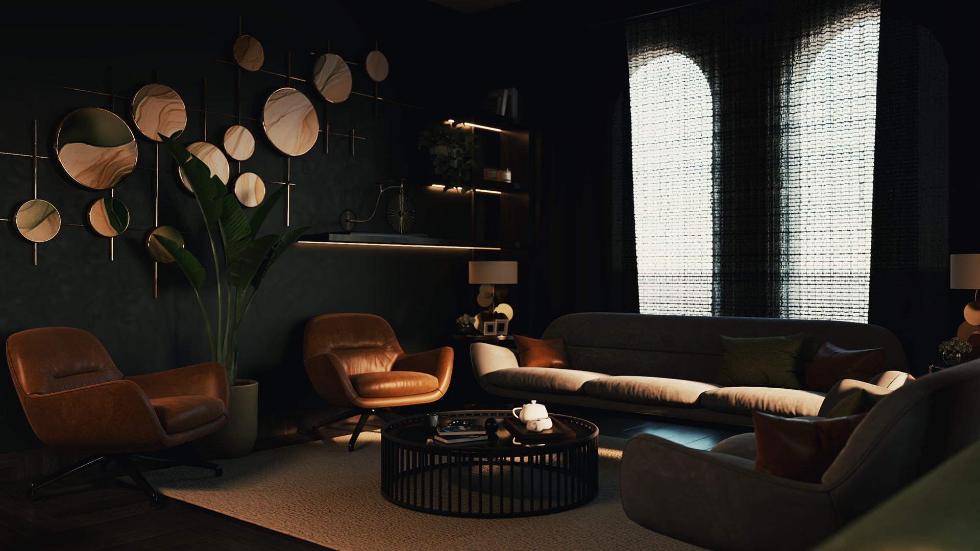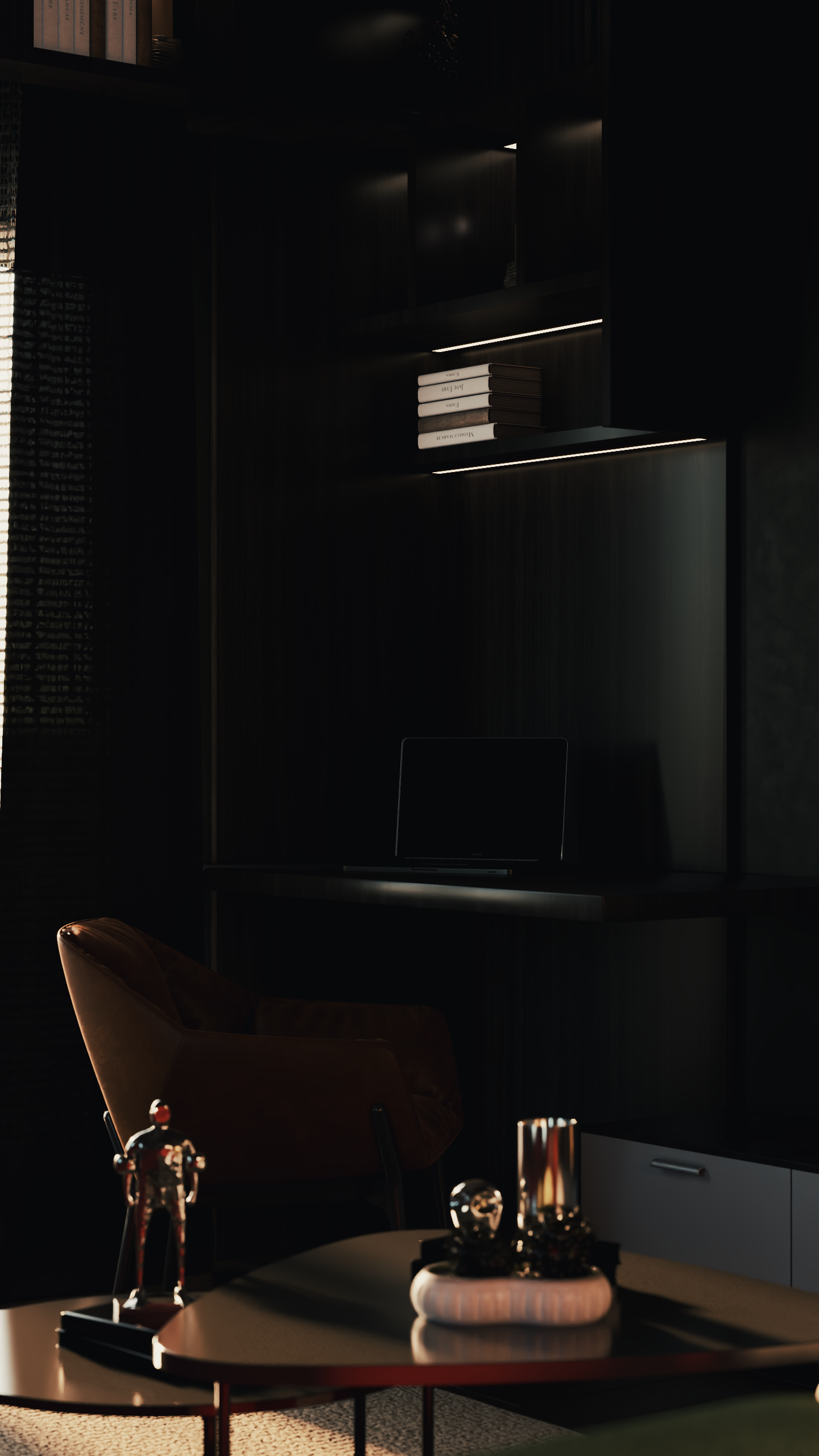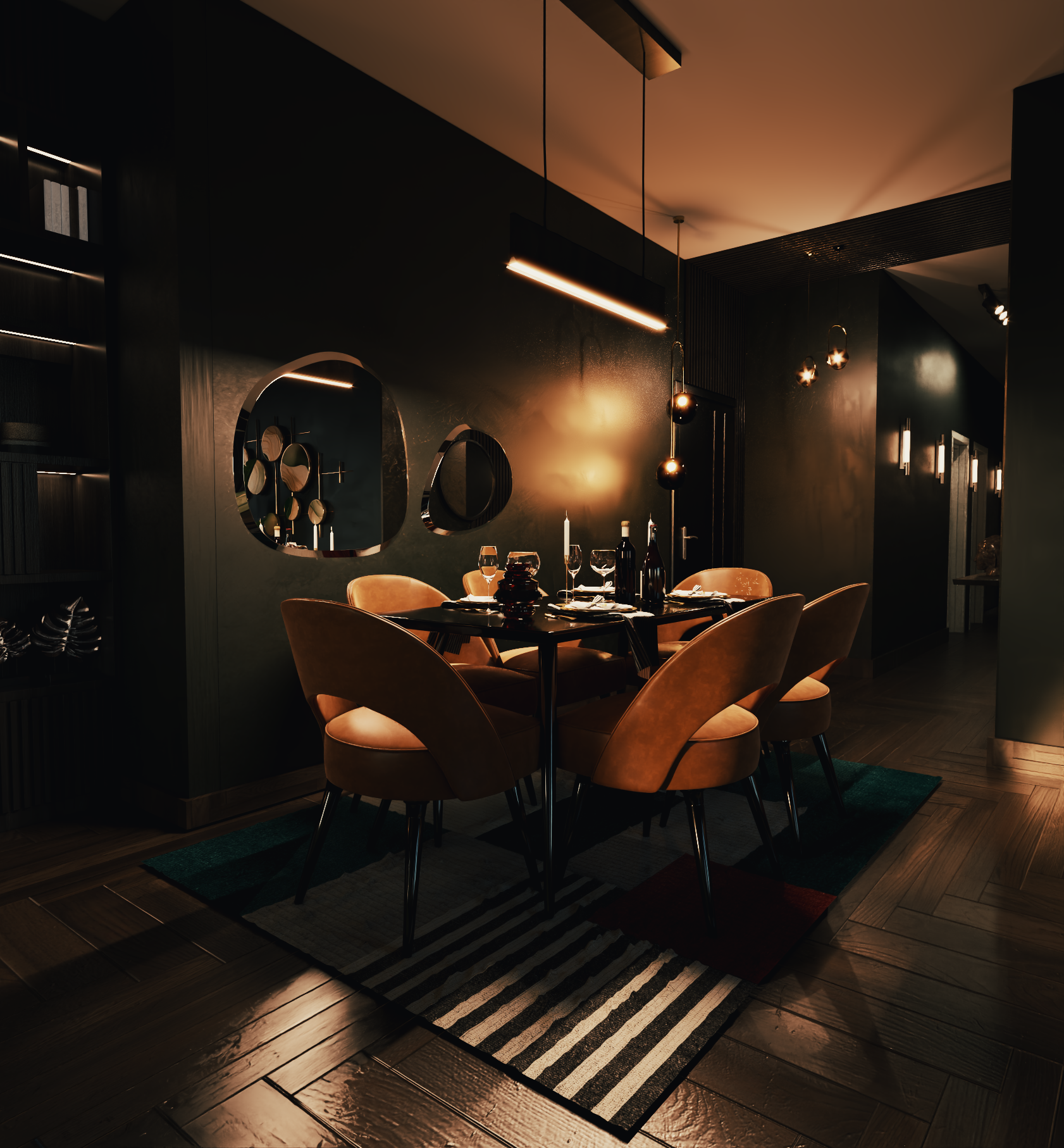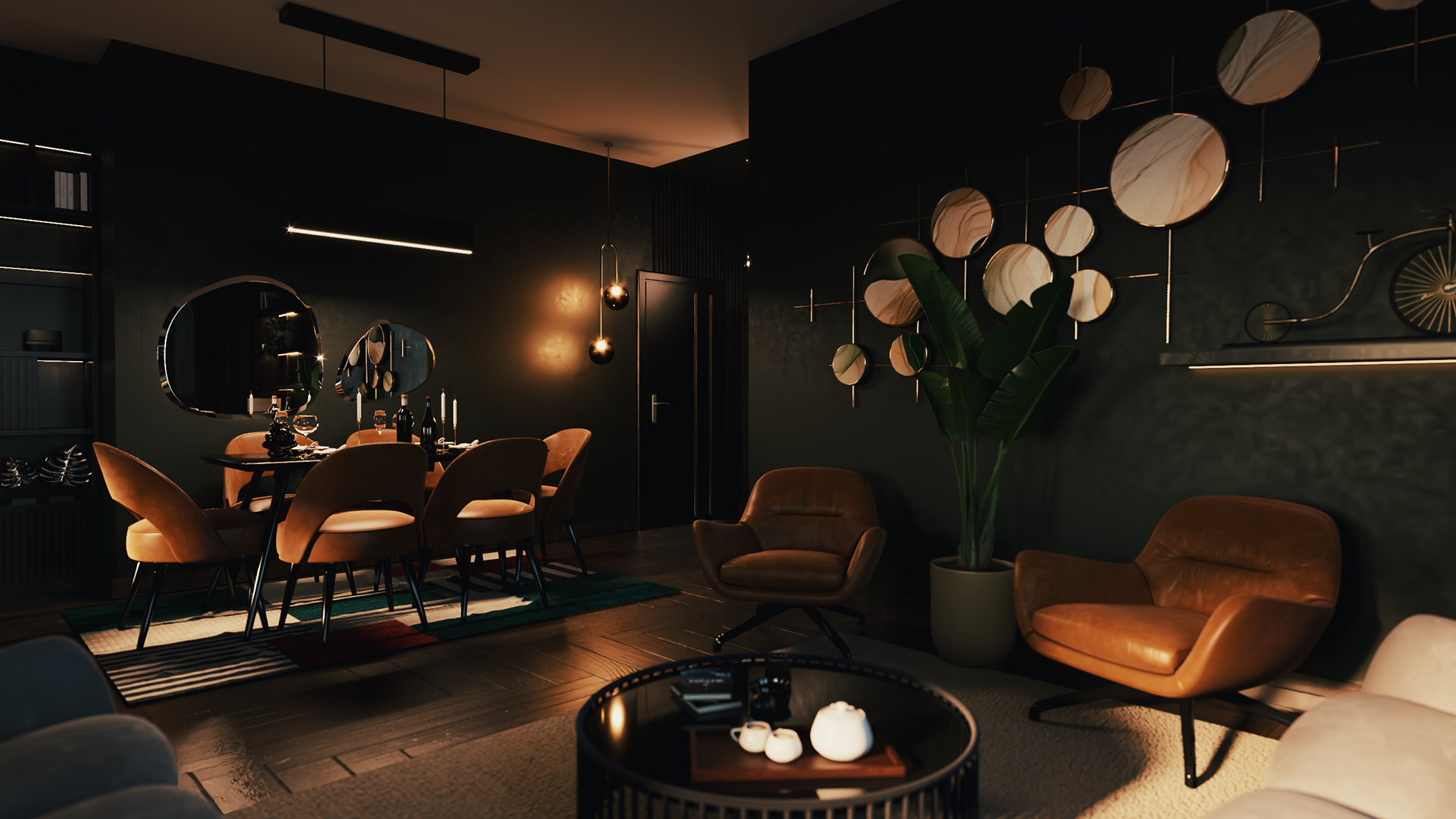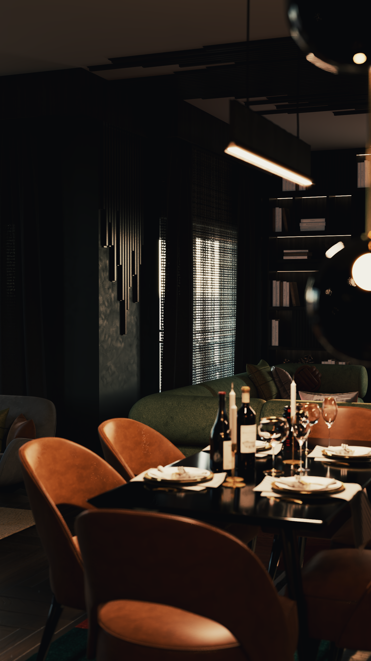 This project presents a modern luxury apartment designed to evoke a refined, intimate, and atmospheric living experience. The space is centered around an open-plan living and dining area, where functionality and aesthetics seamlessly merge.