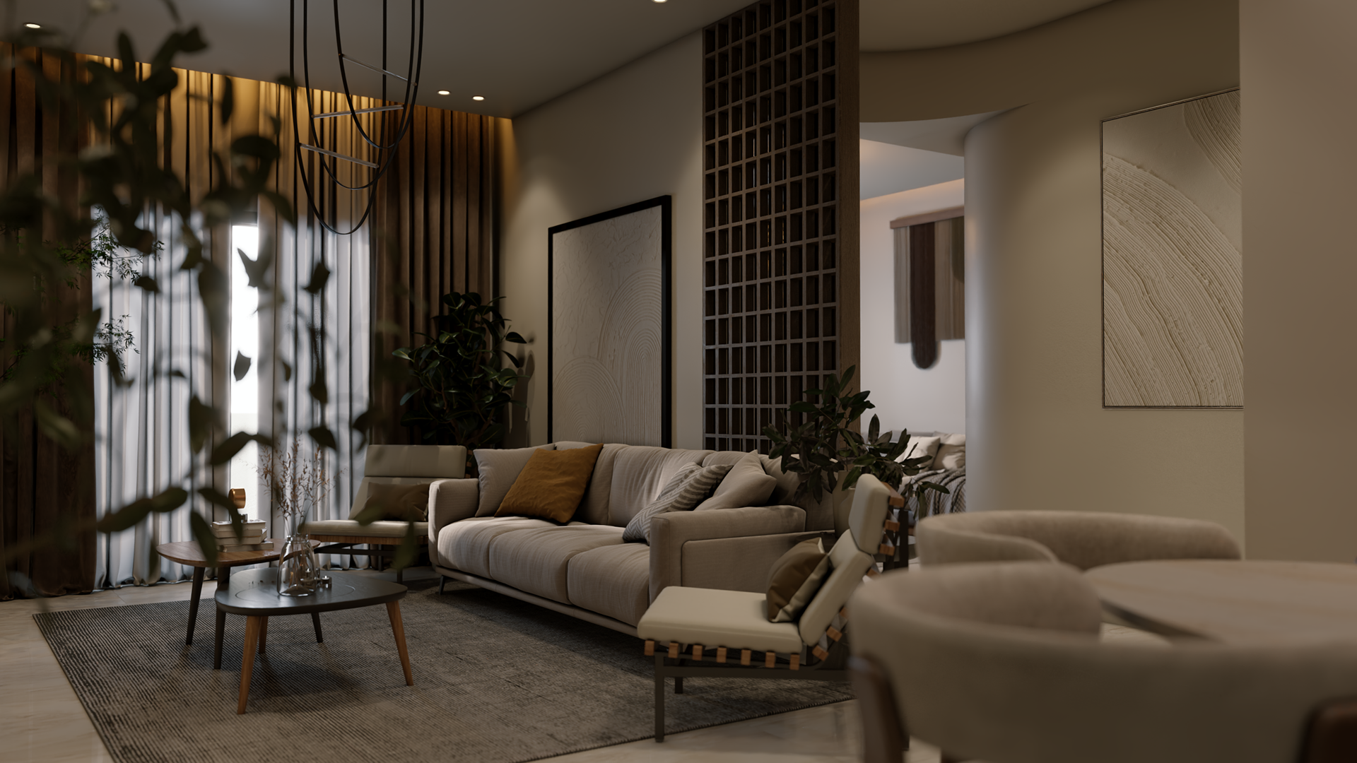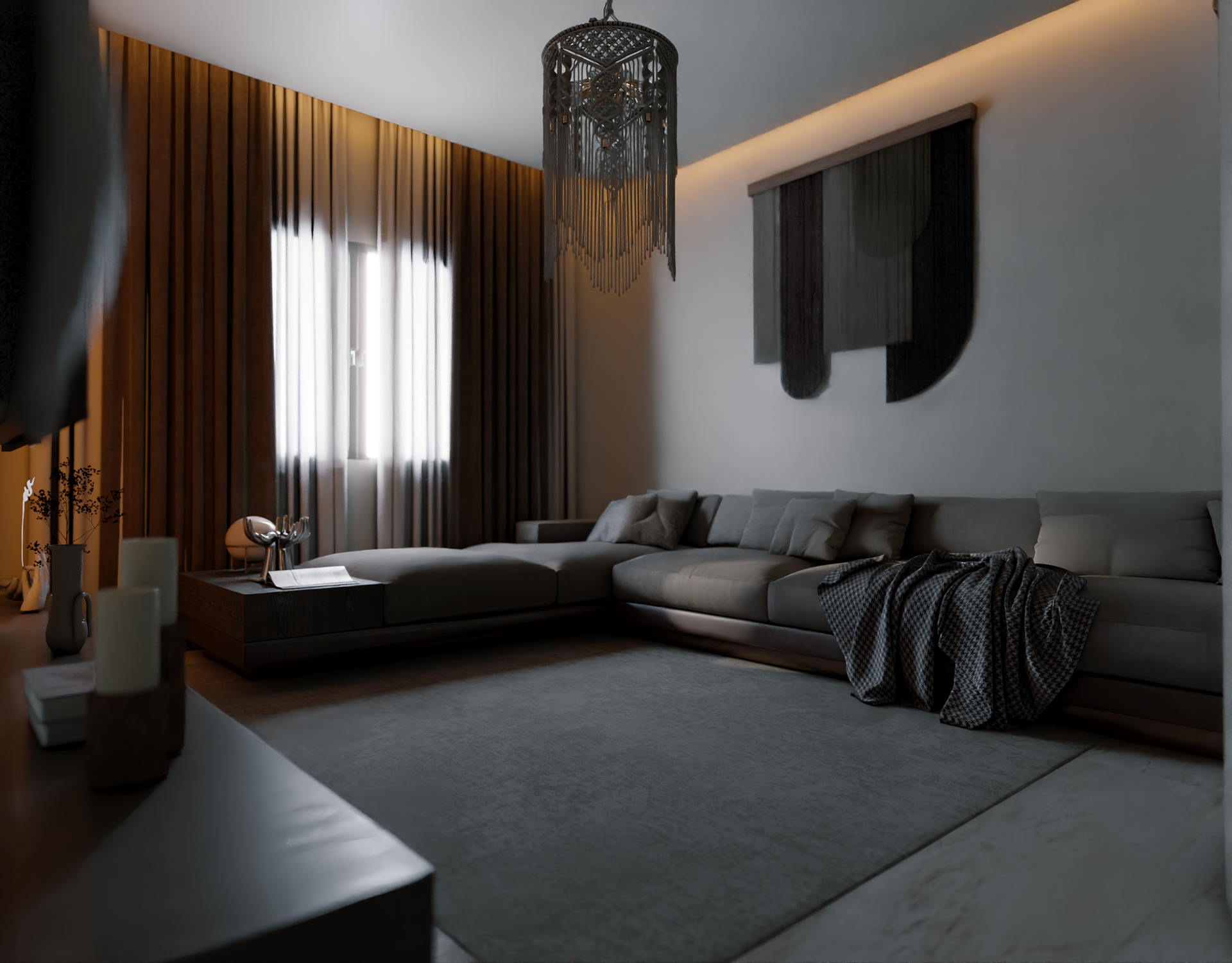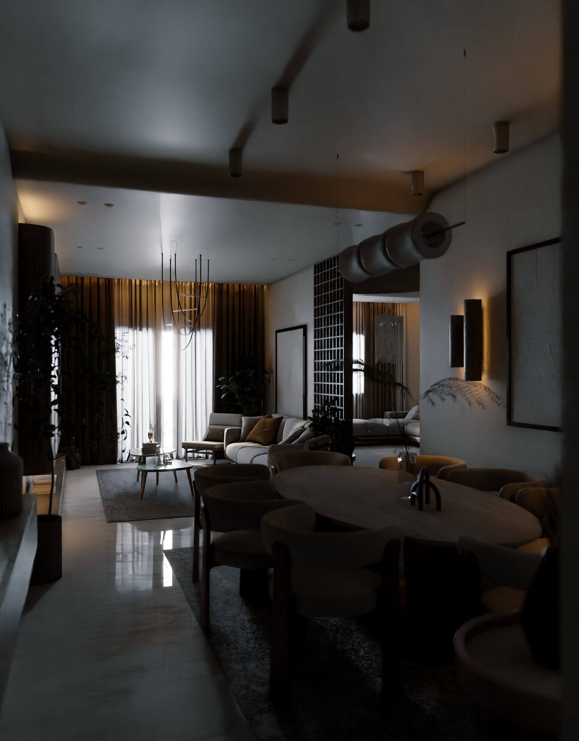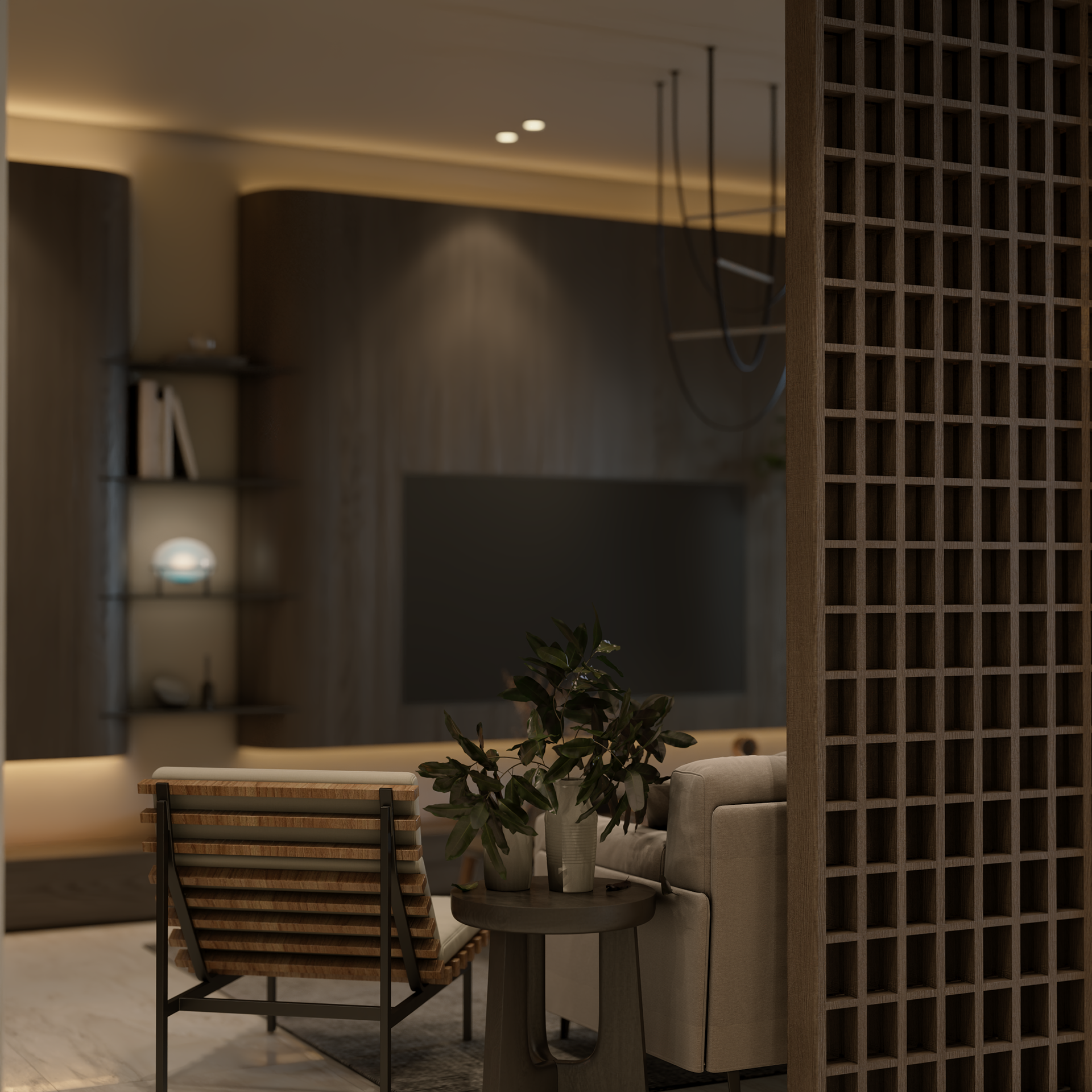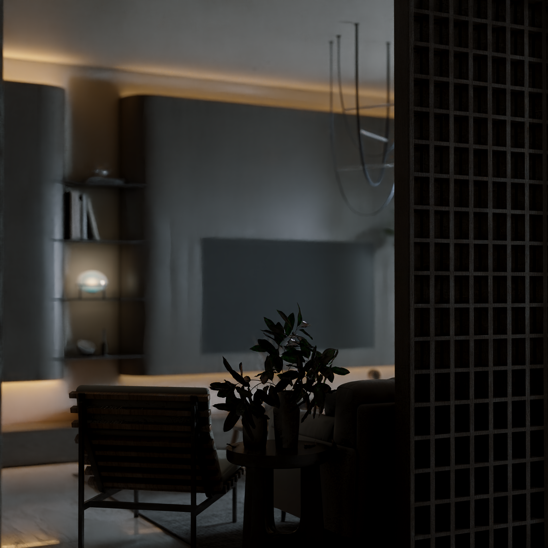 The apartment with just the indirect lights on