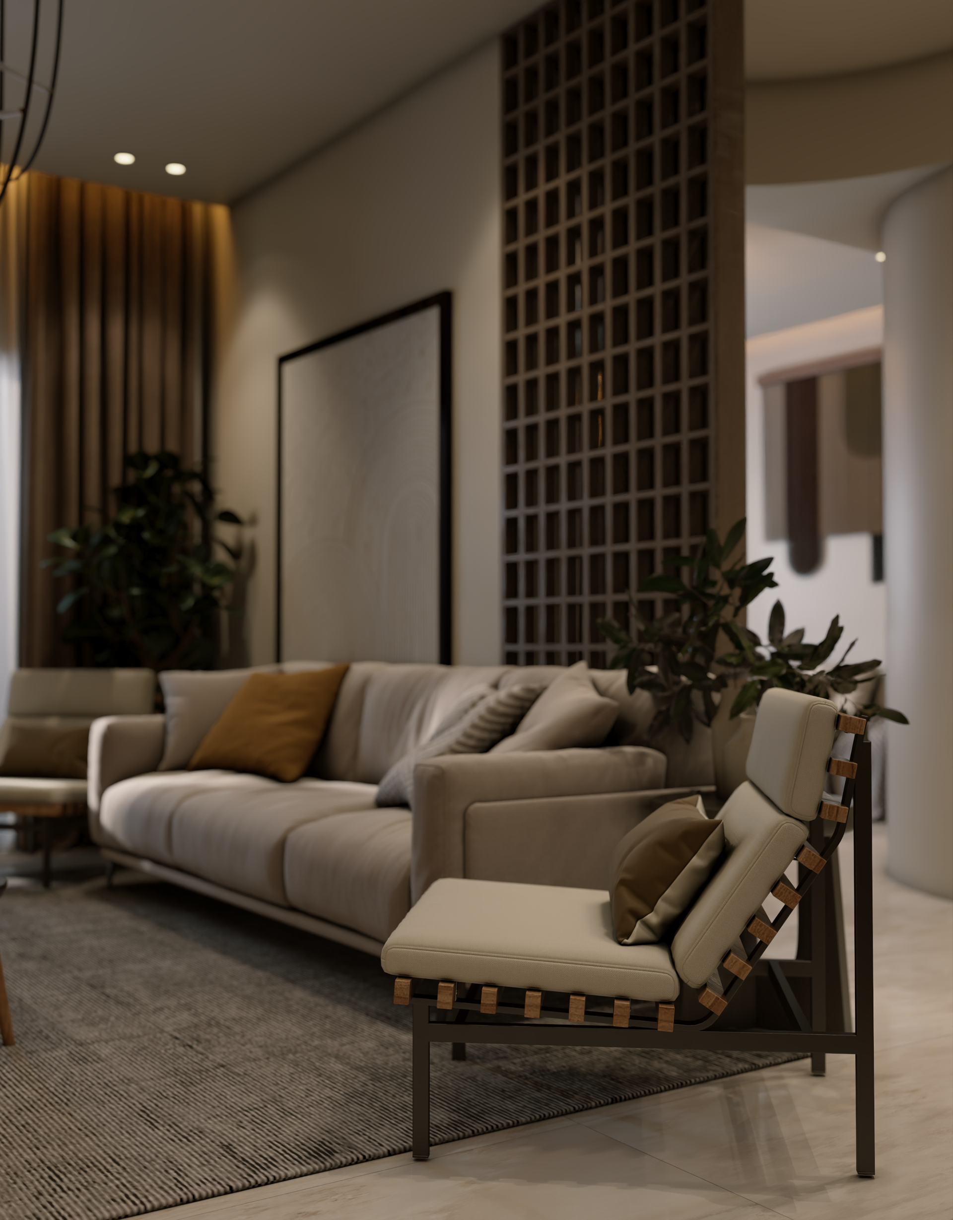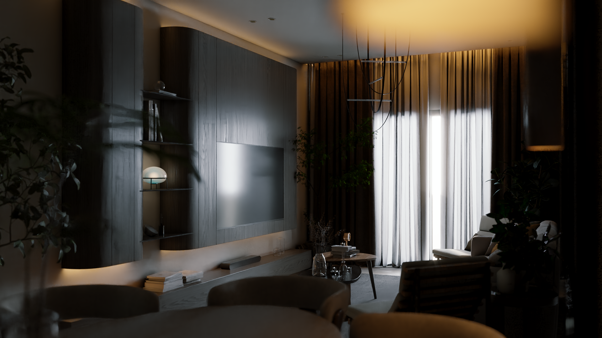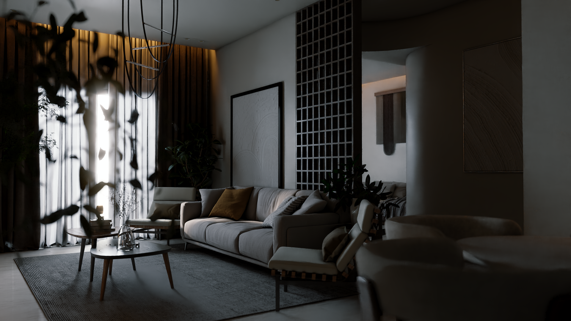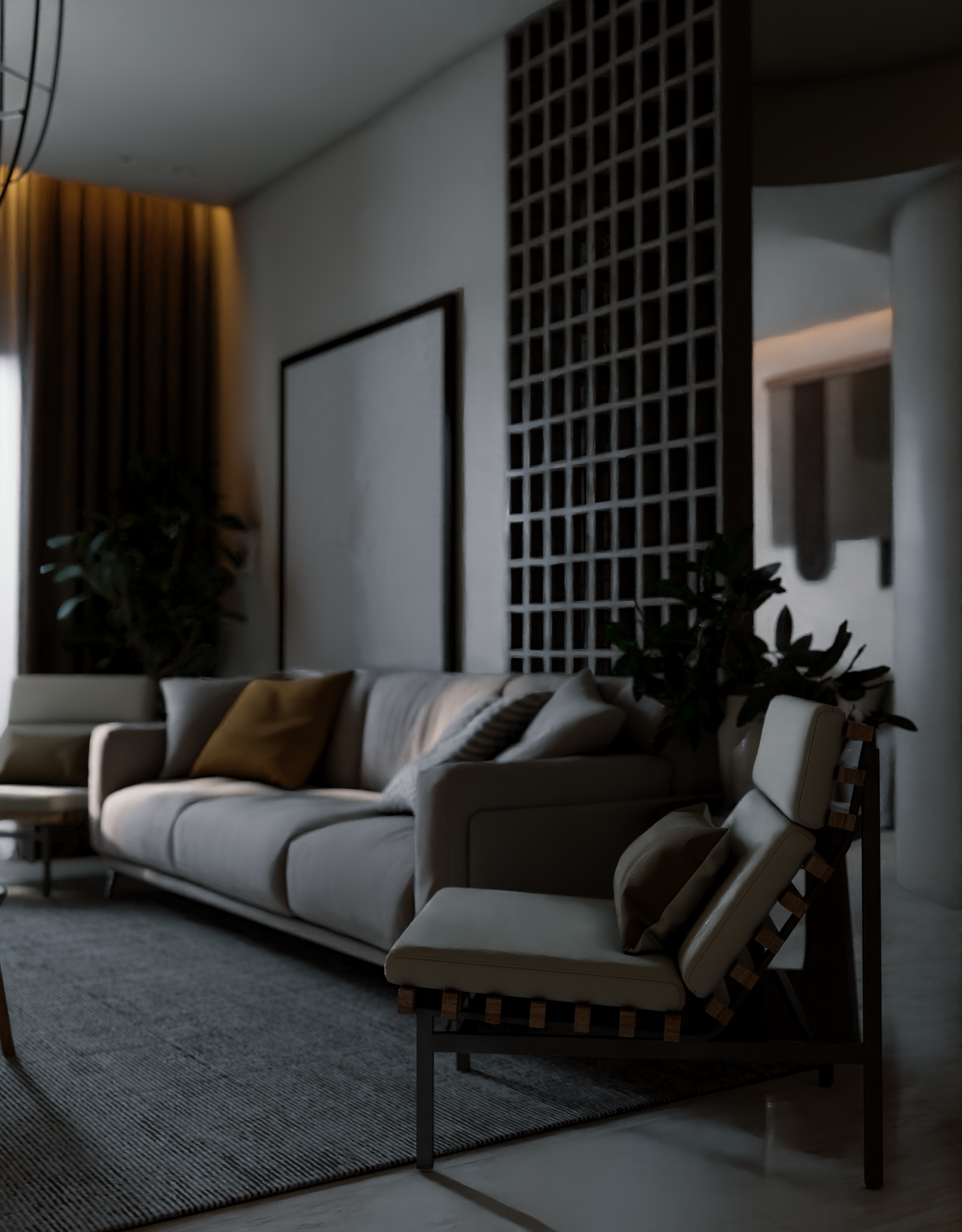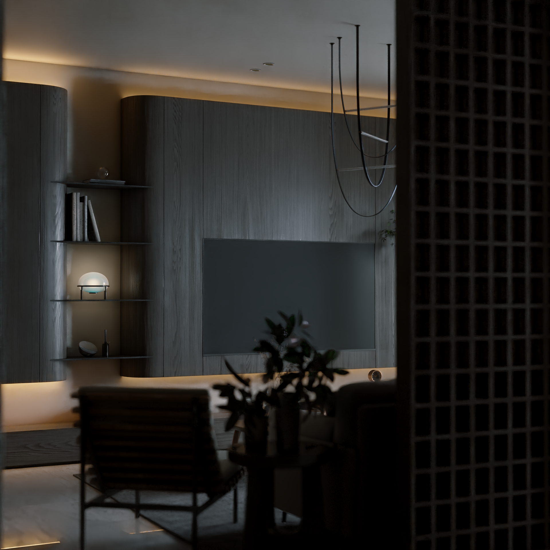 The apartment with just the indirect lights on