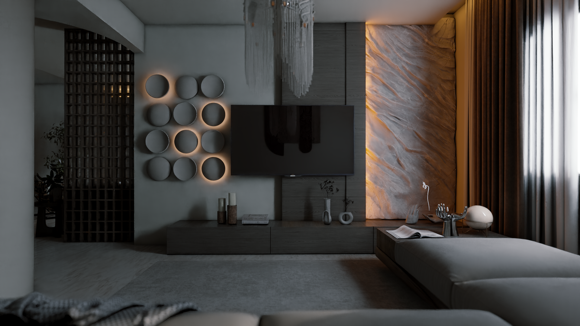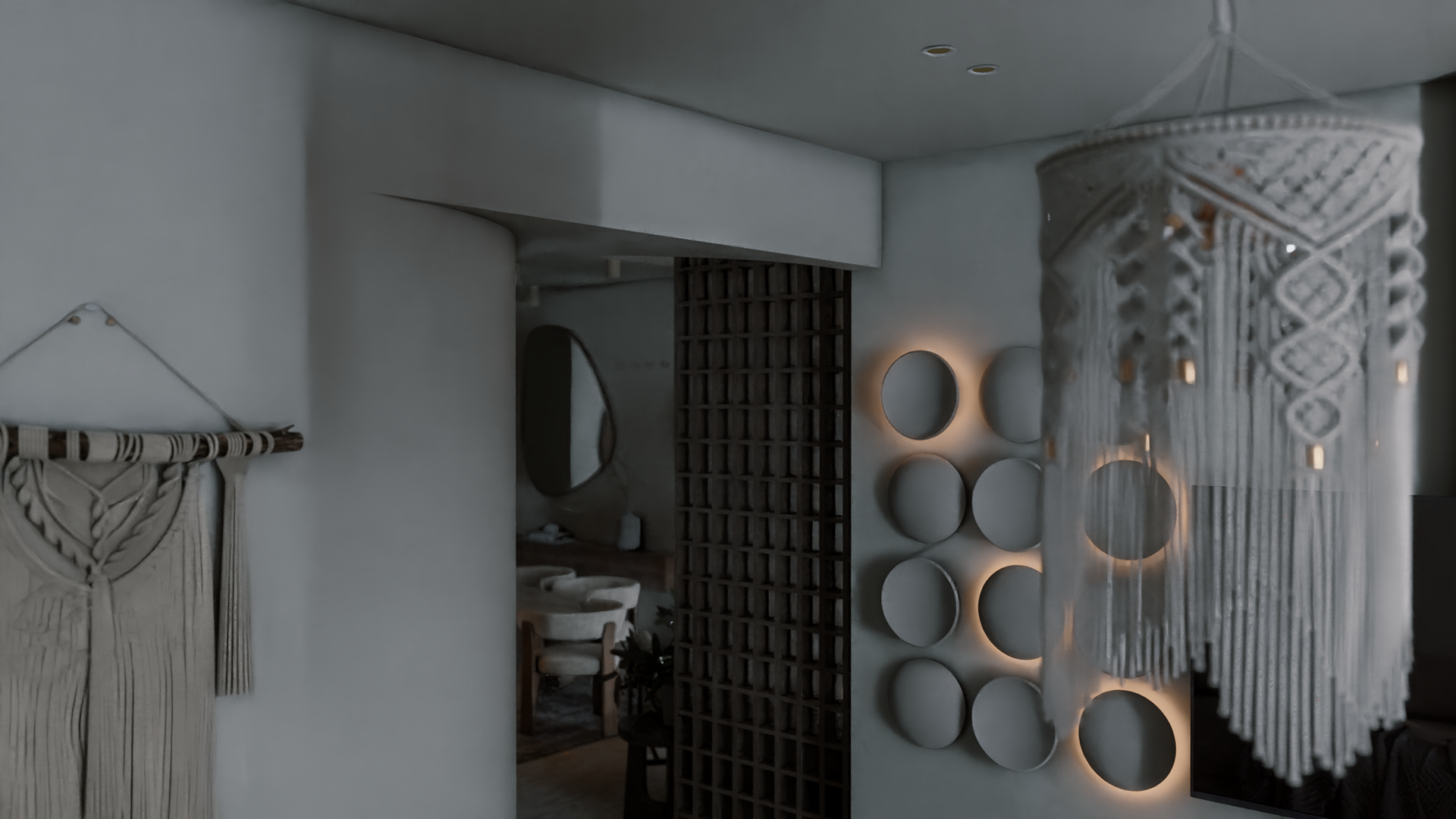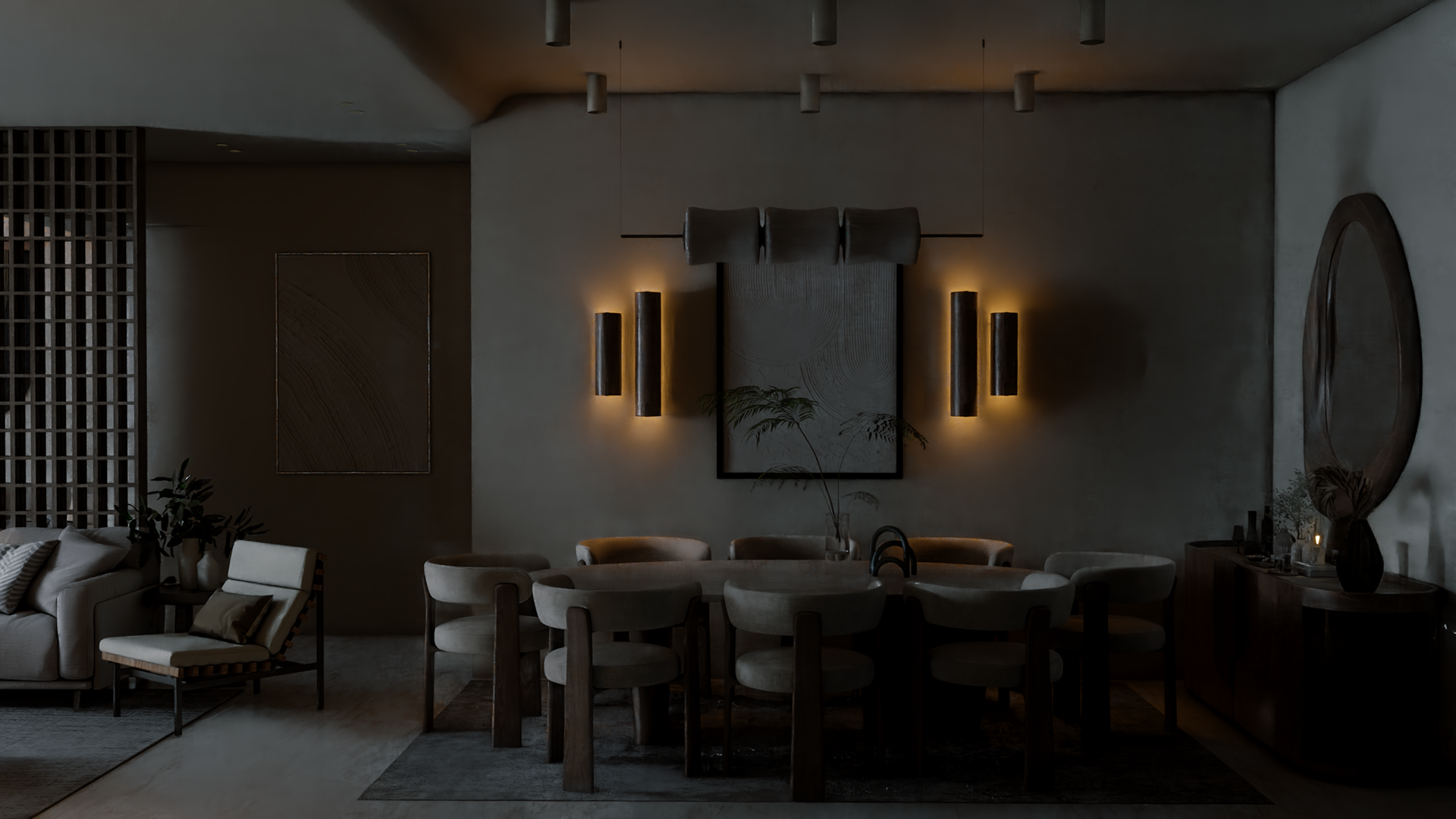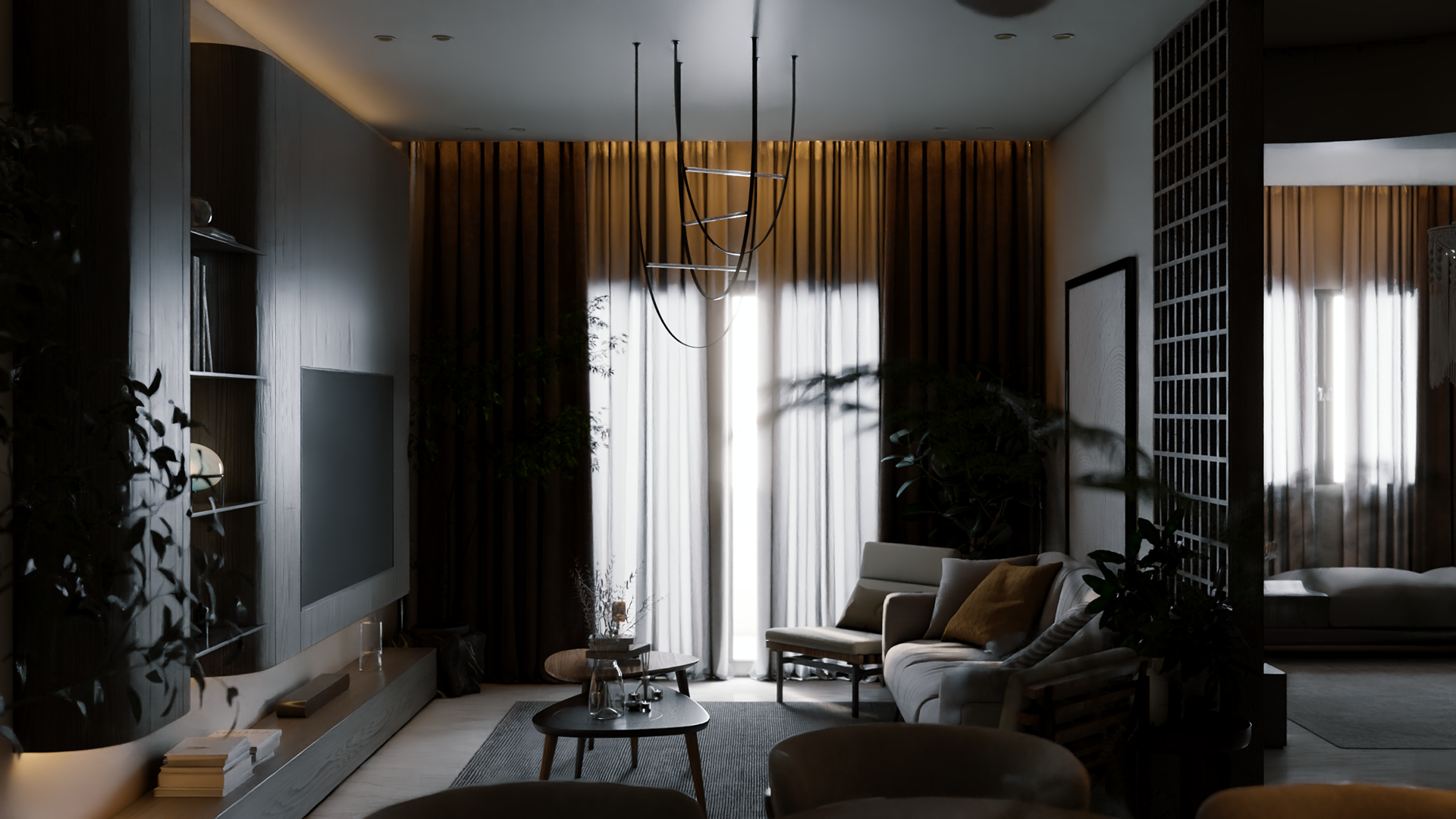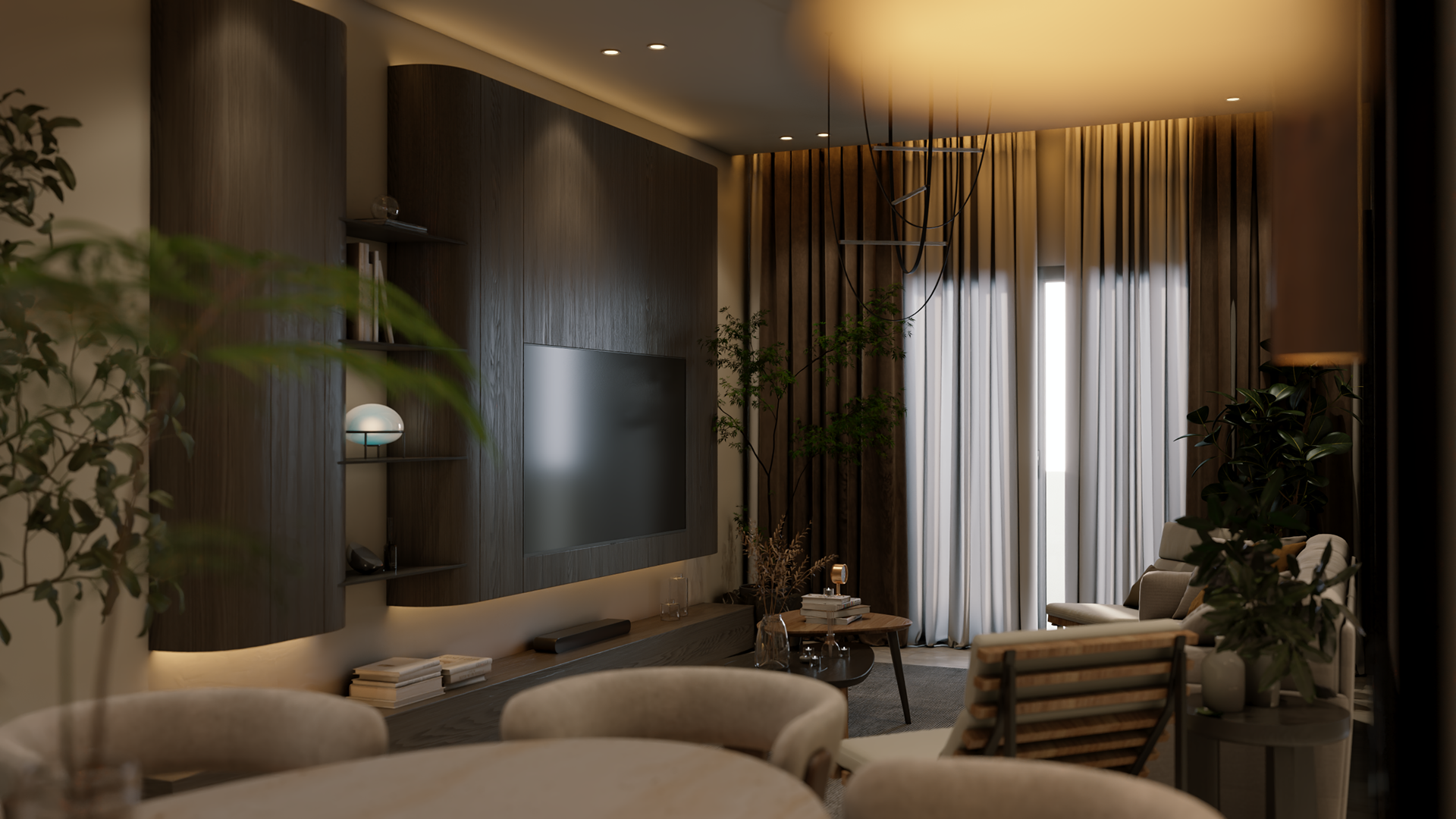 The apartment with just the indirect lights on