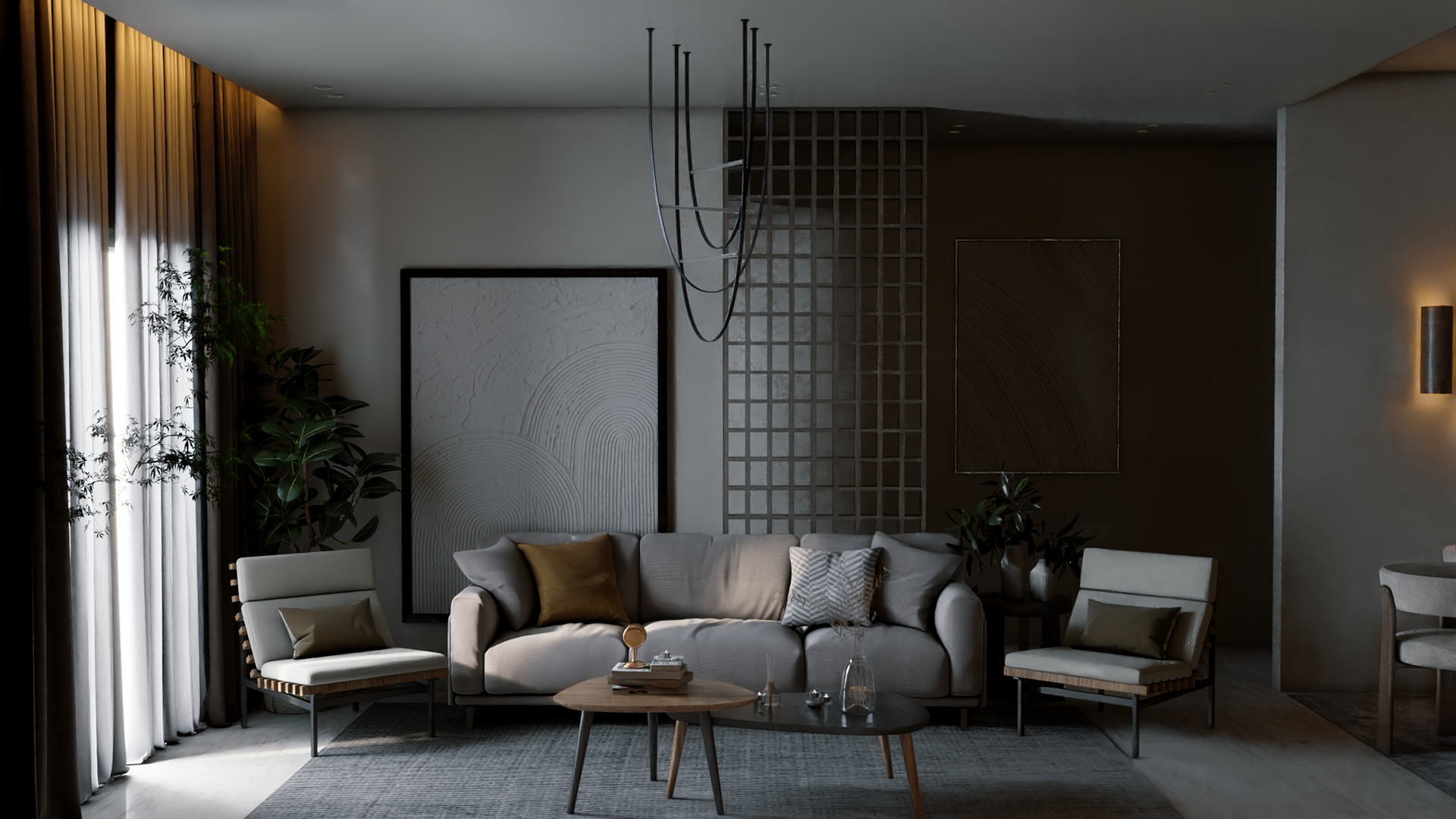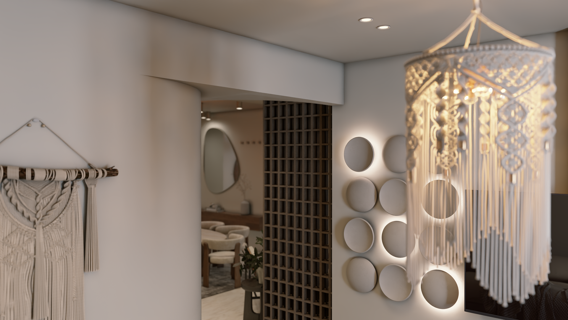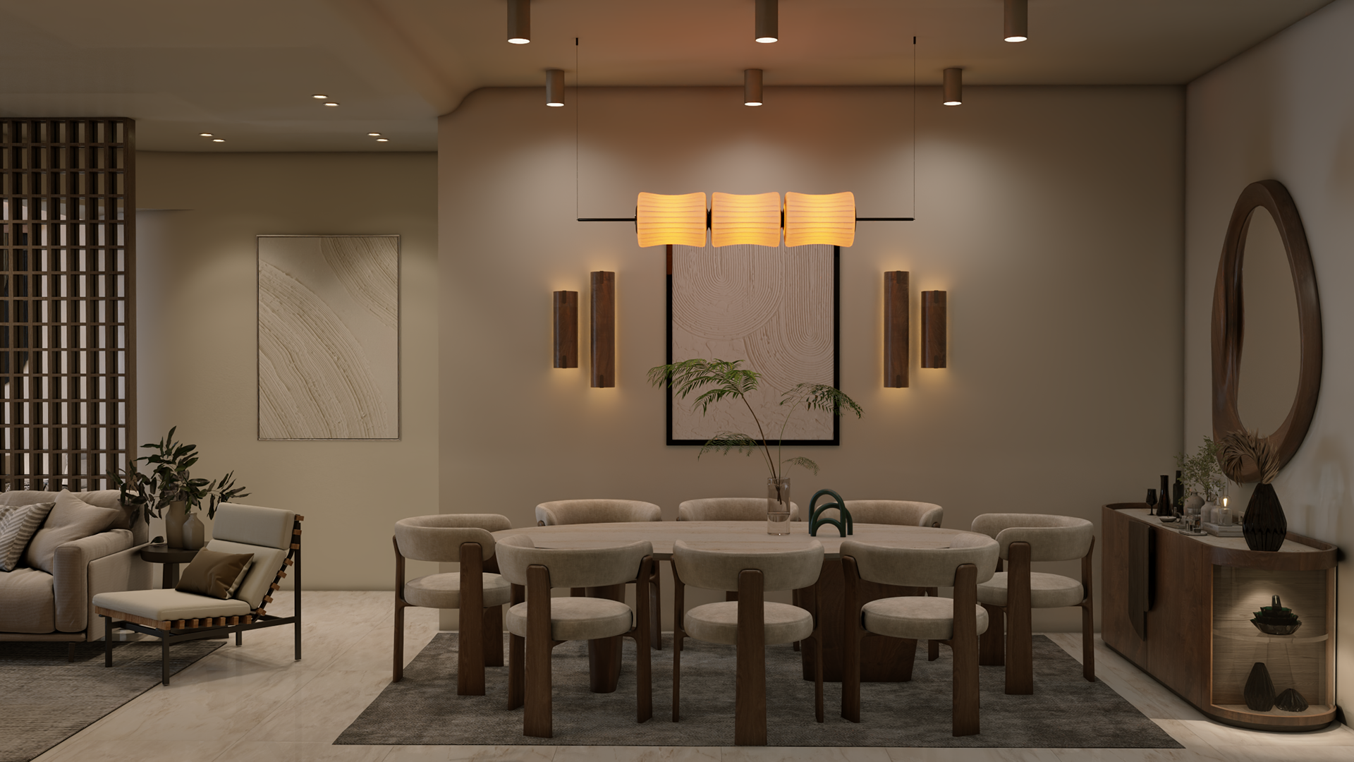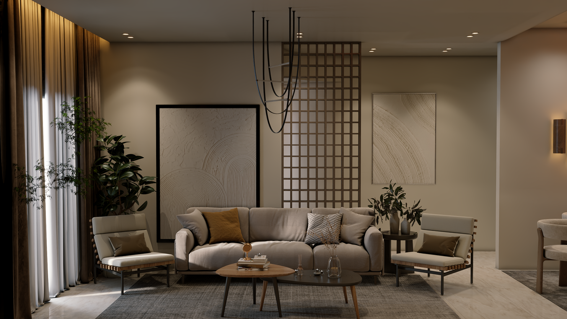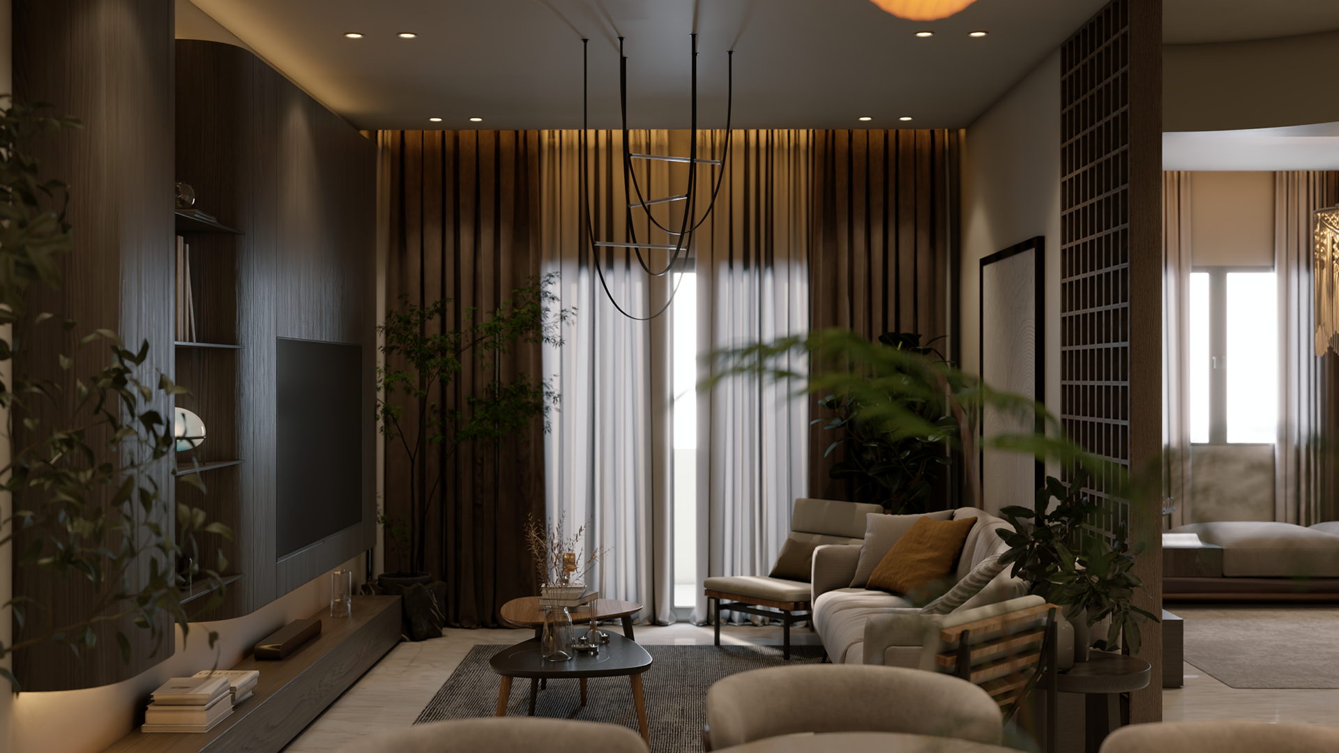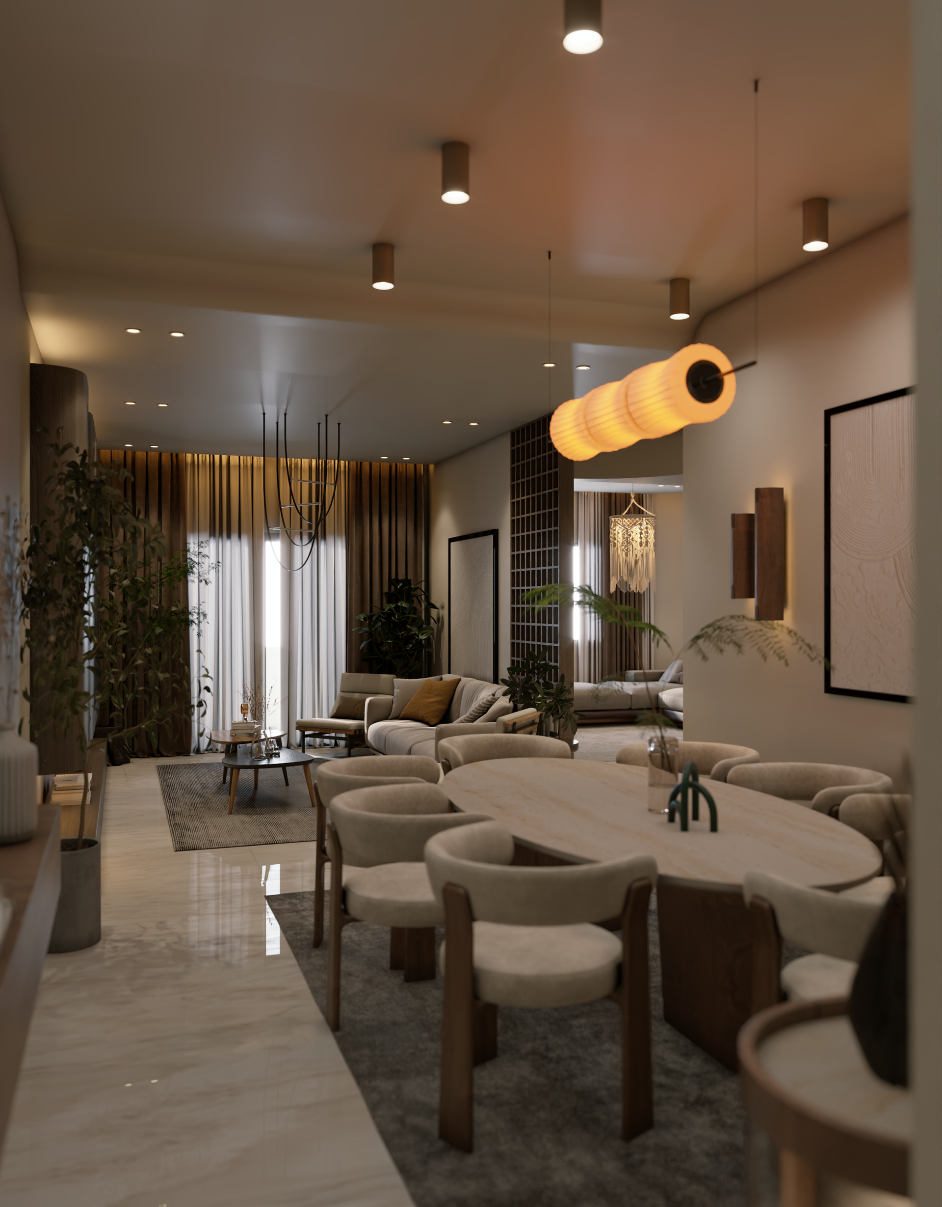 The apartment with just the indirect lights on