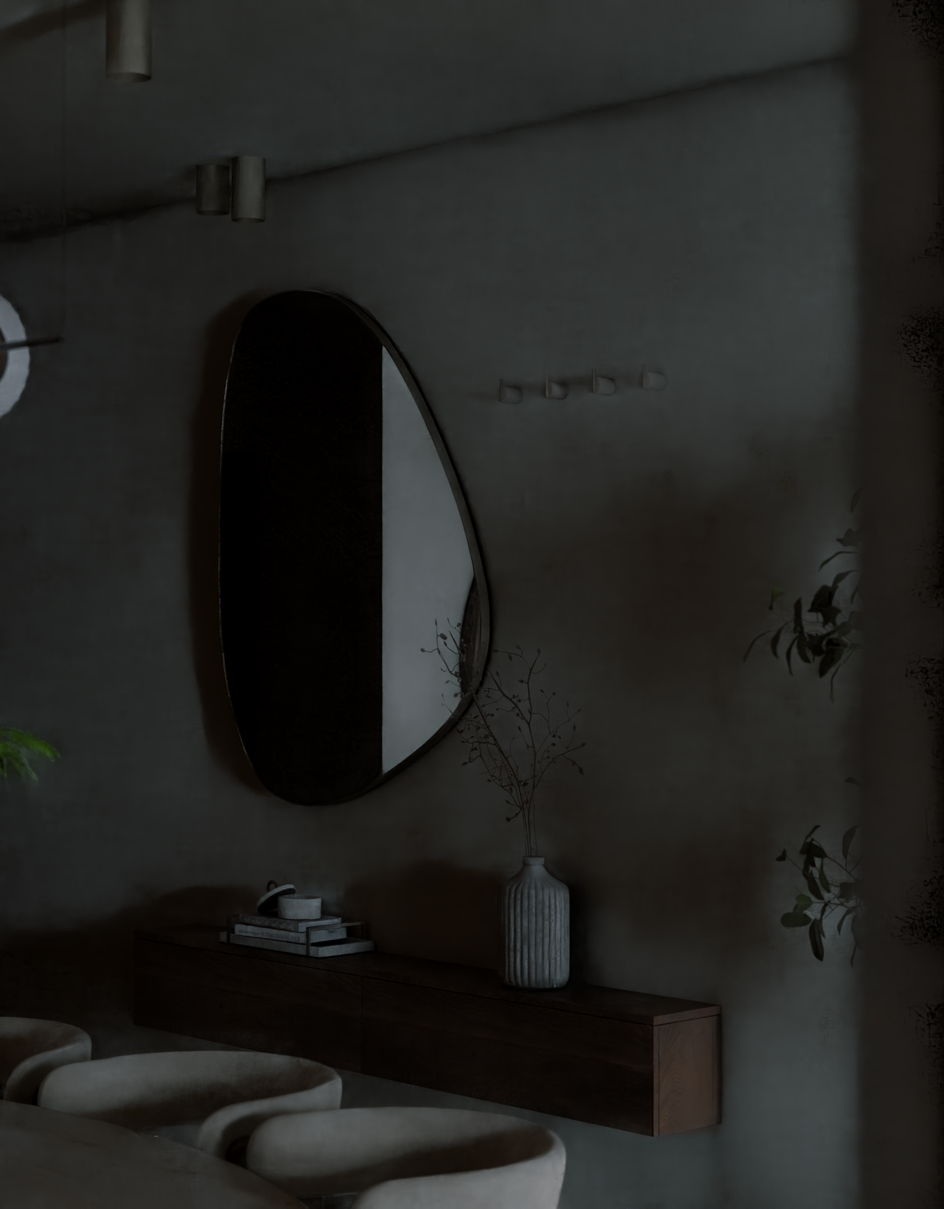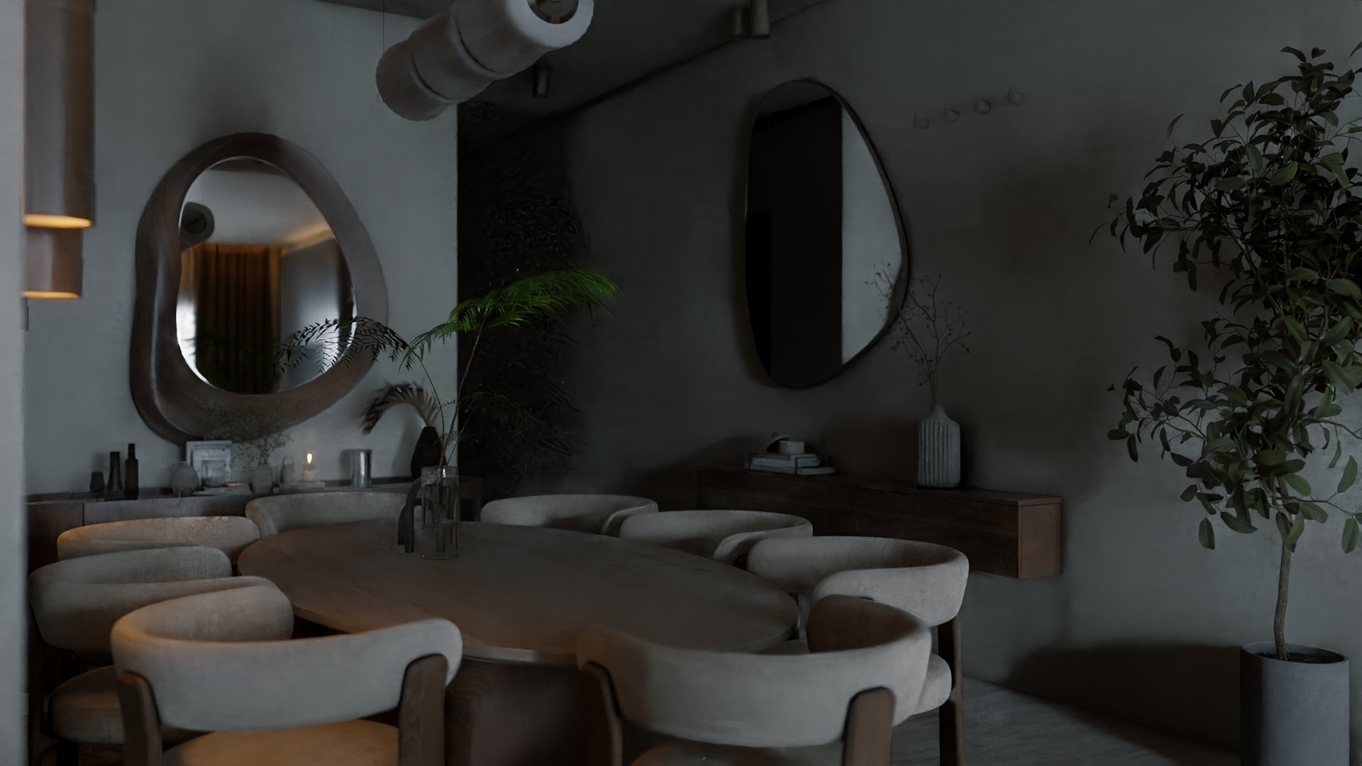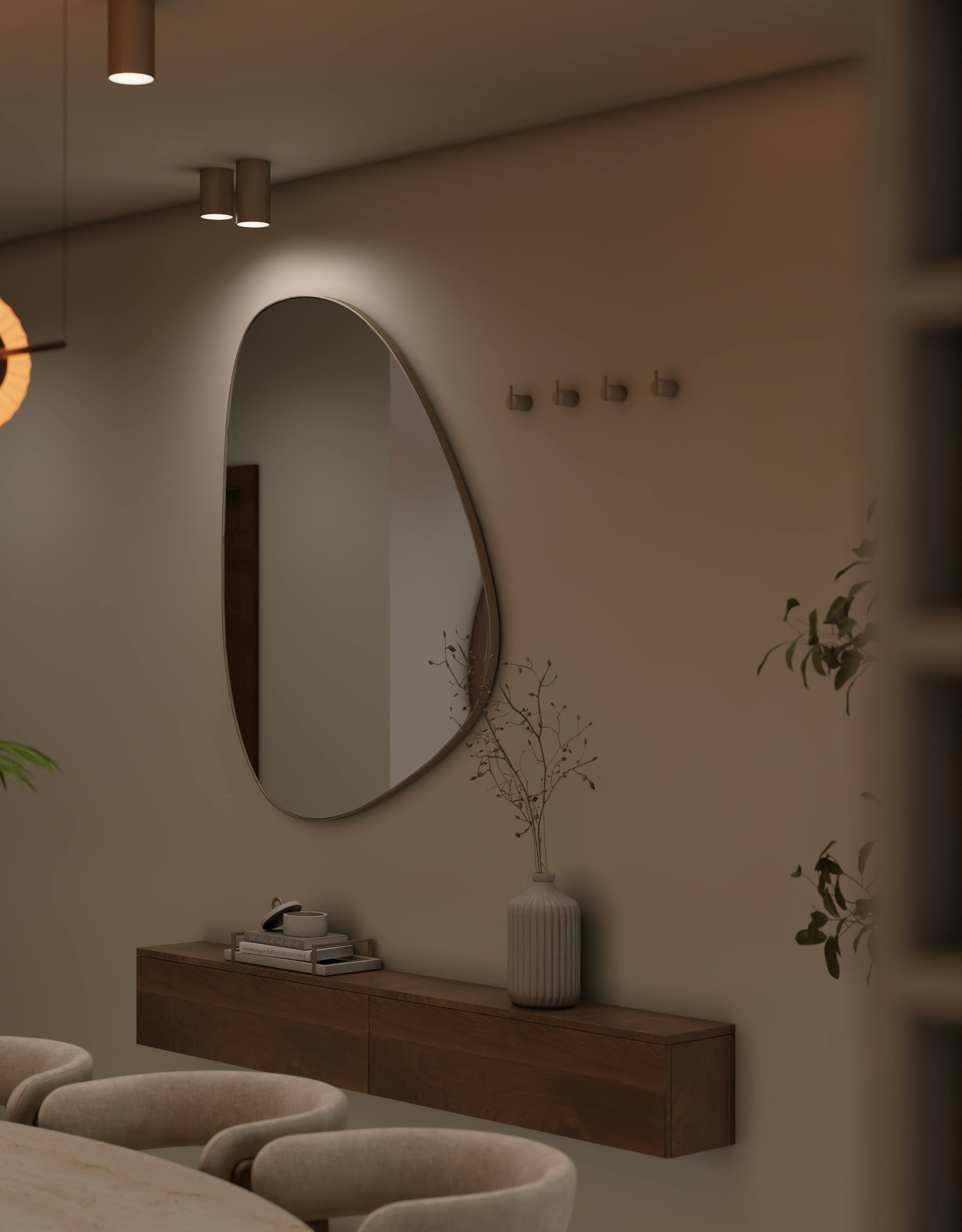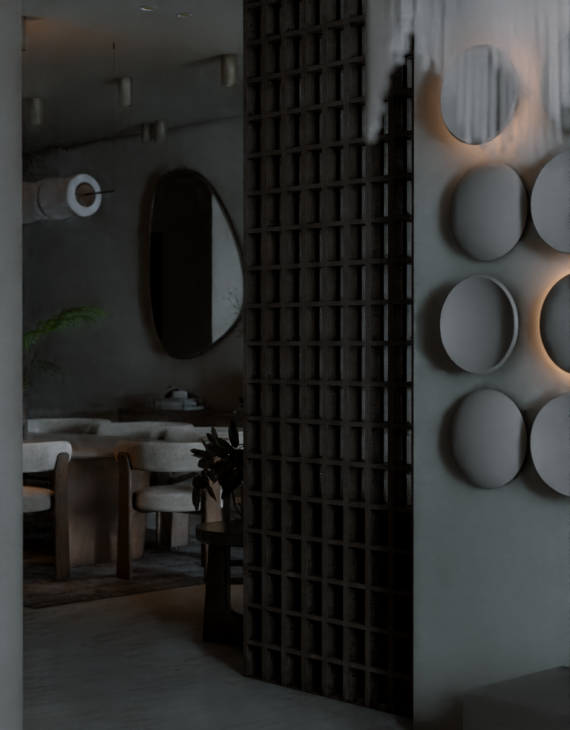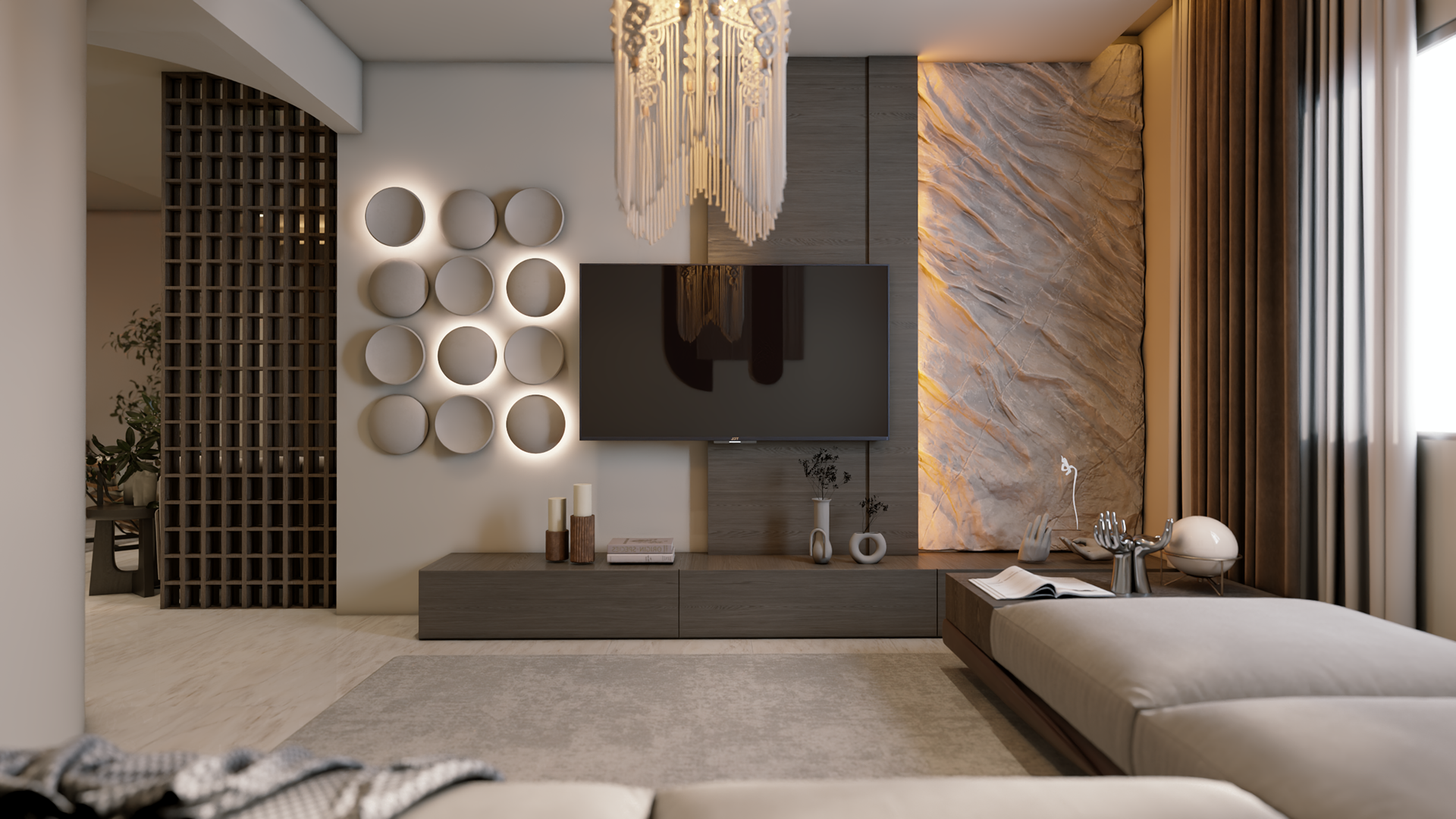 The apartment with just the indirect lights on