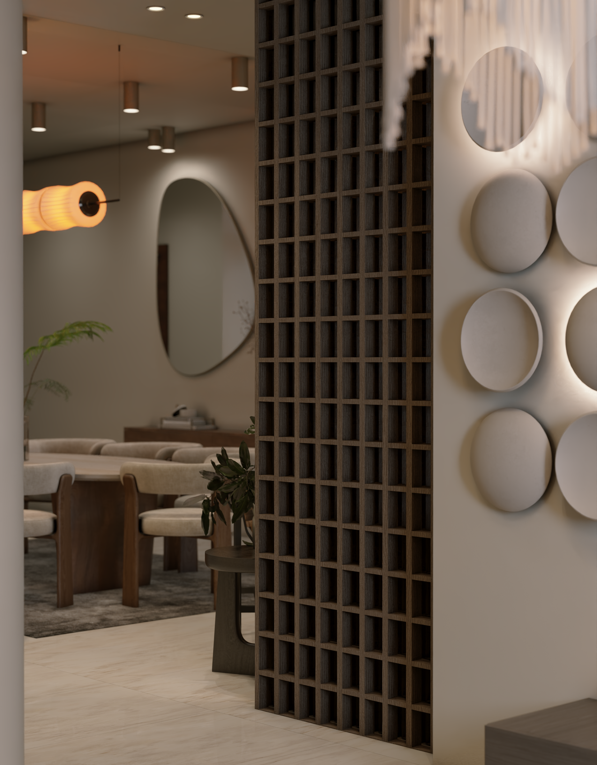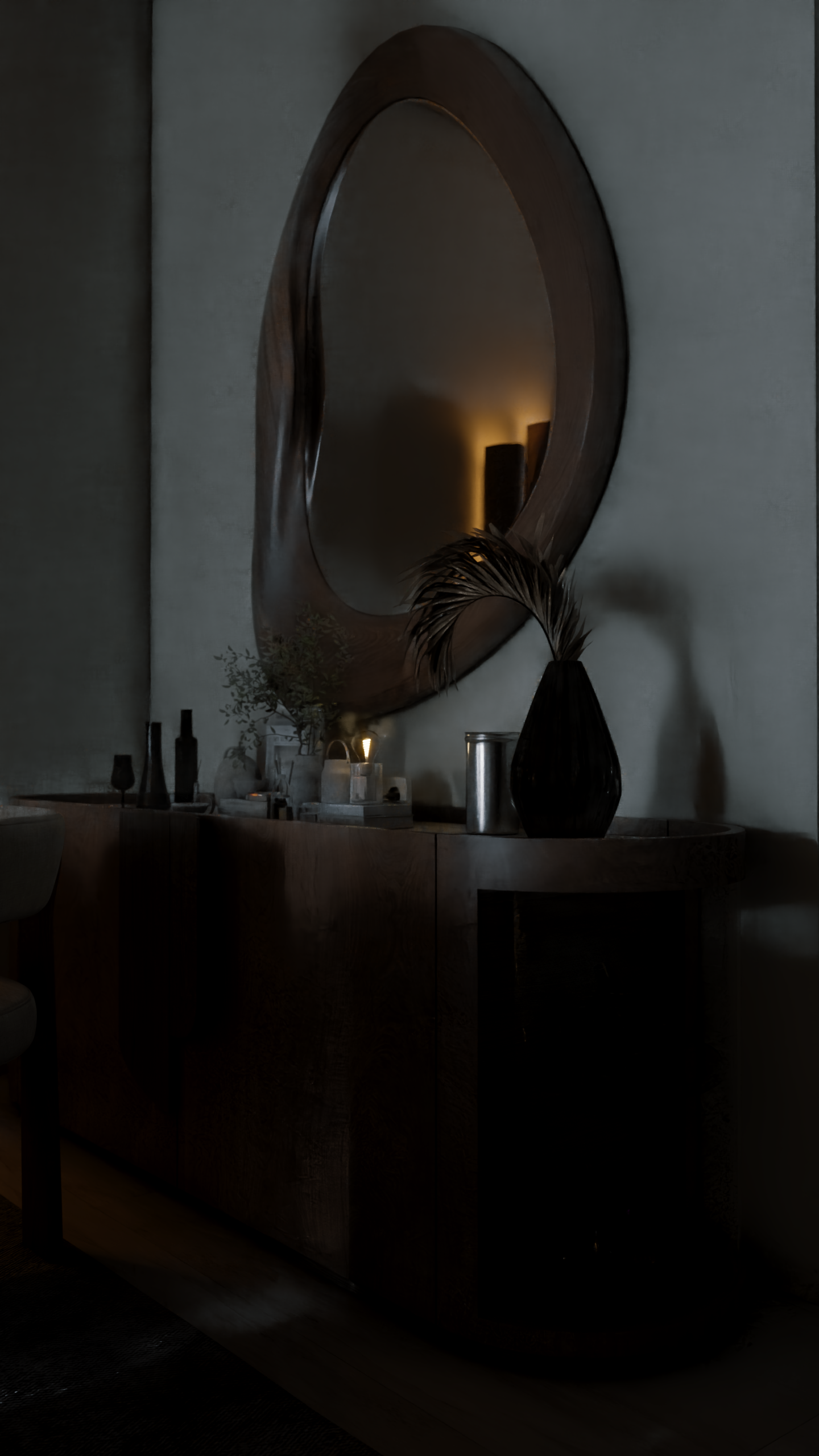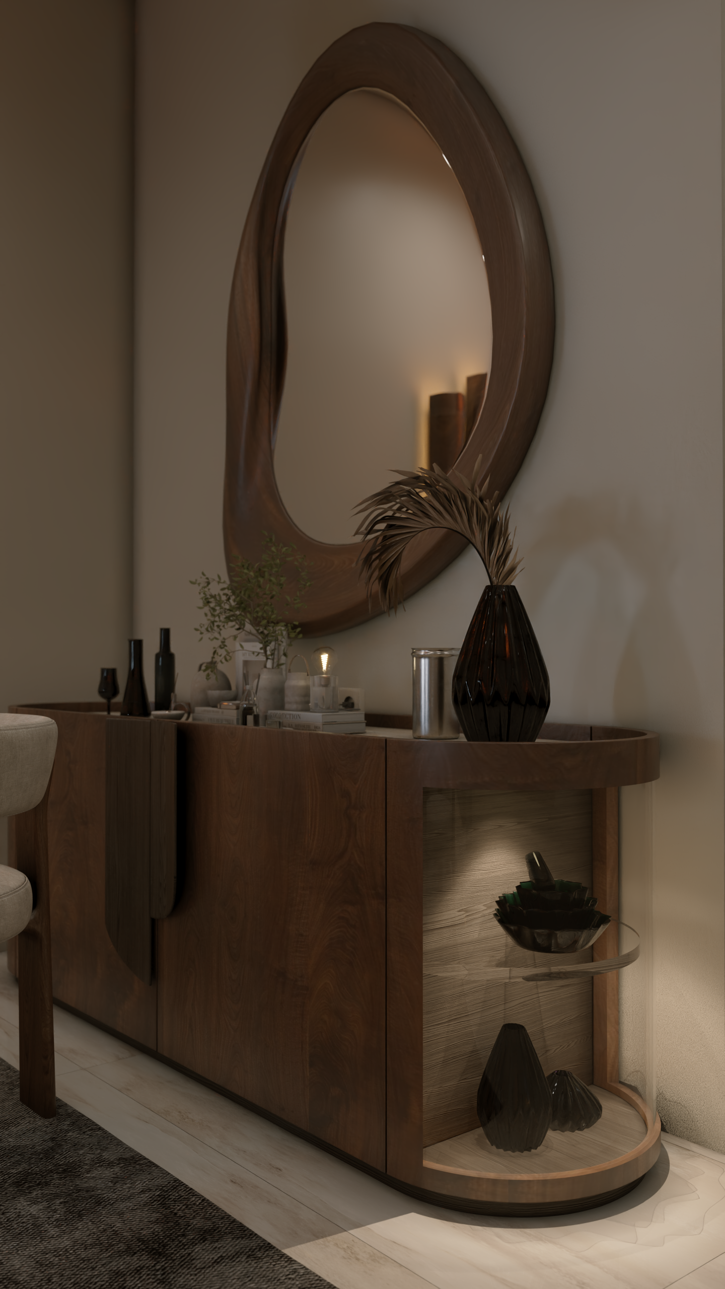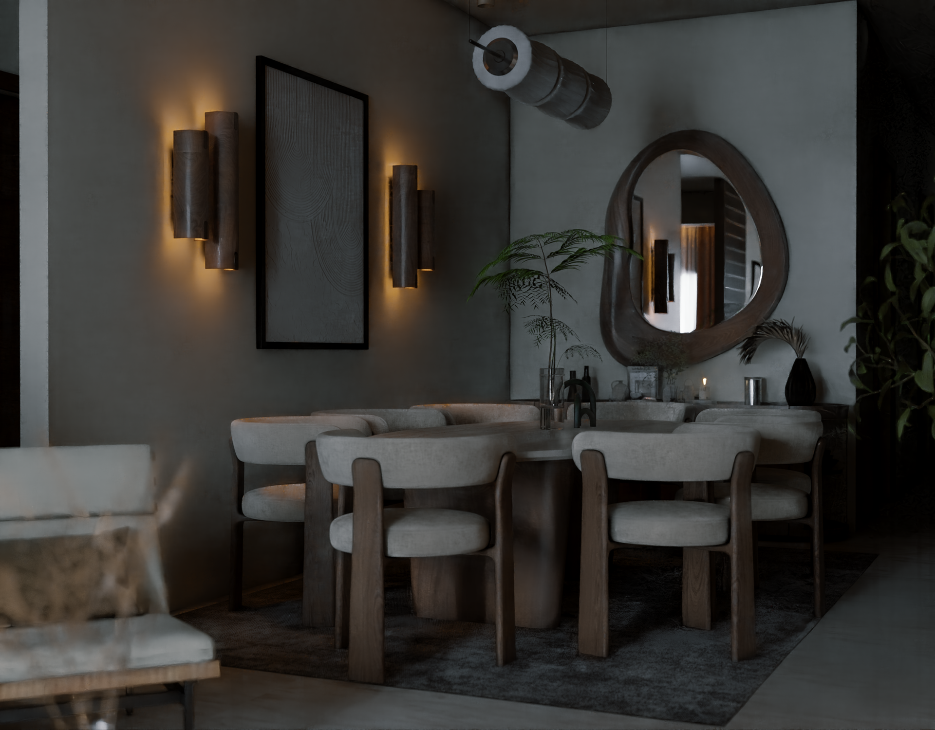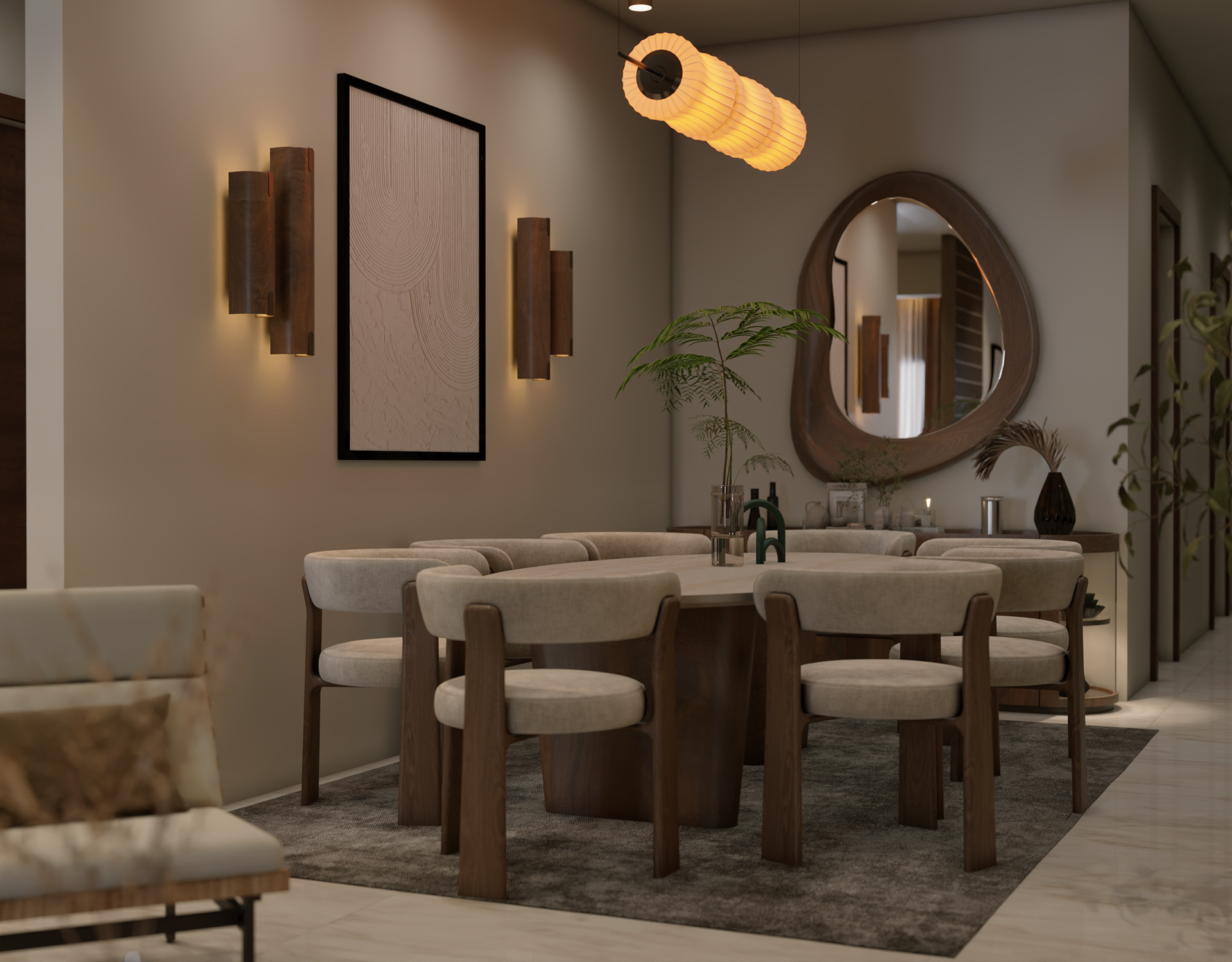 The apartment with just the indirect lights on