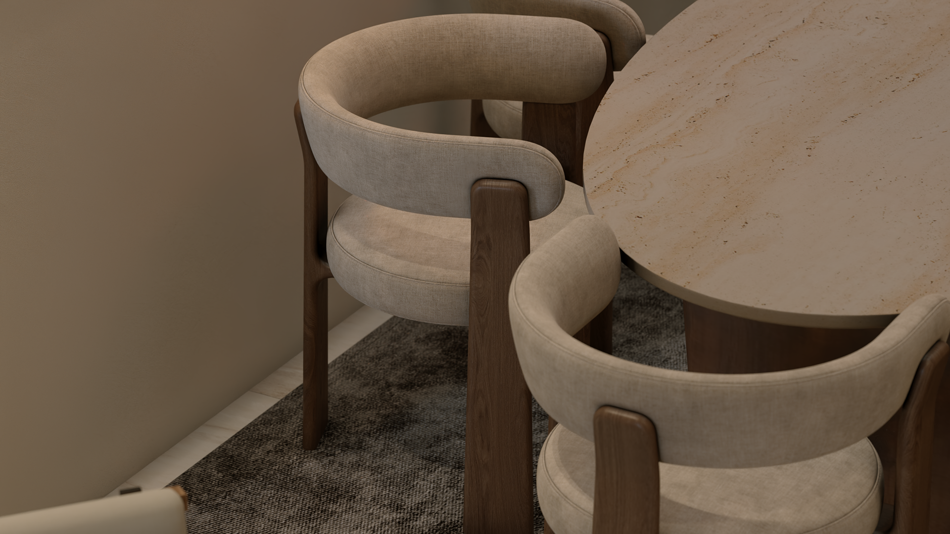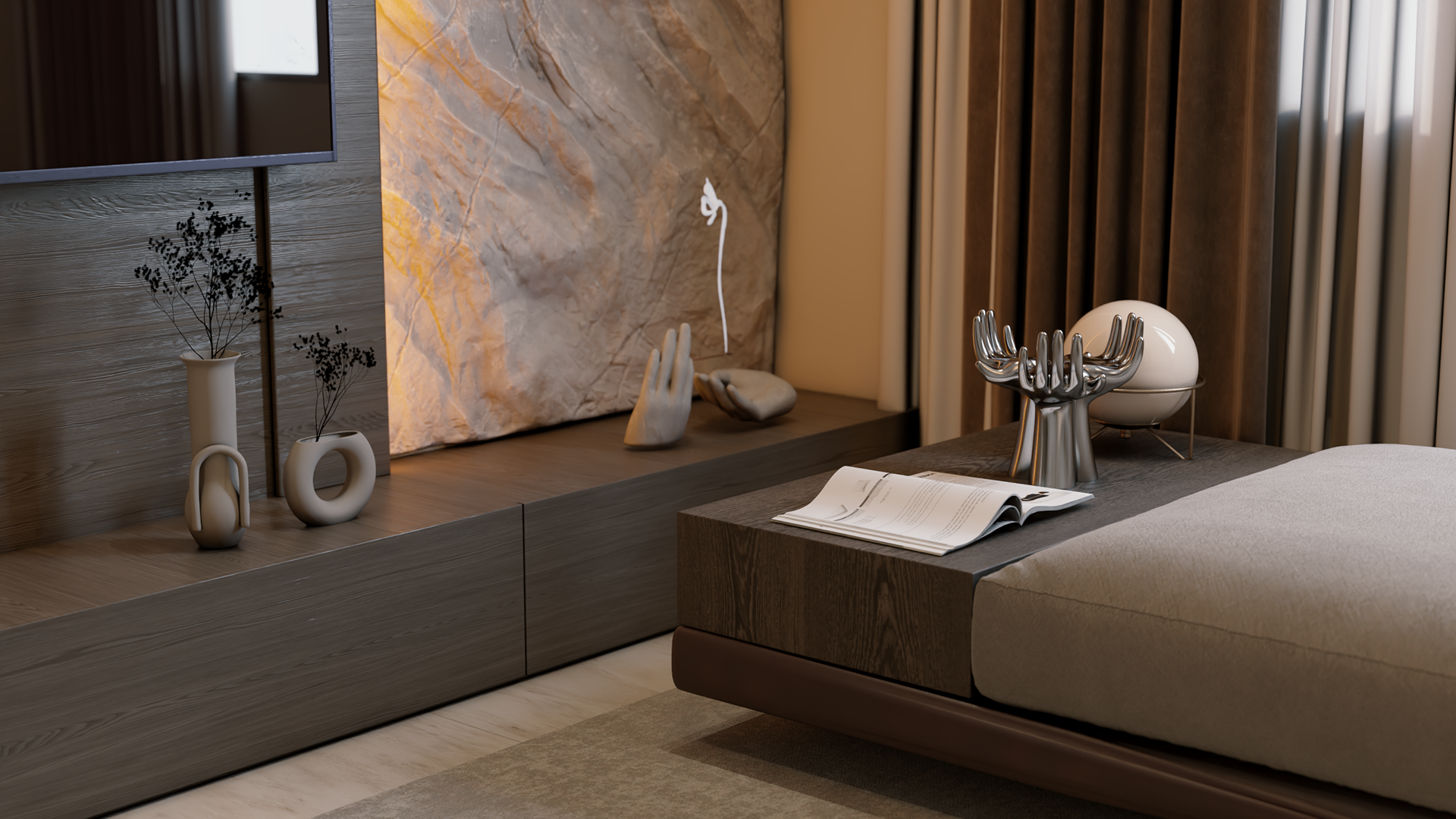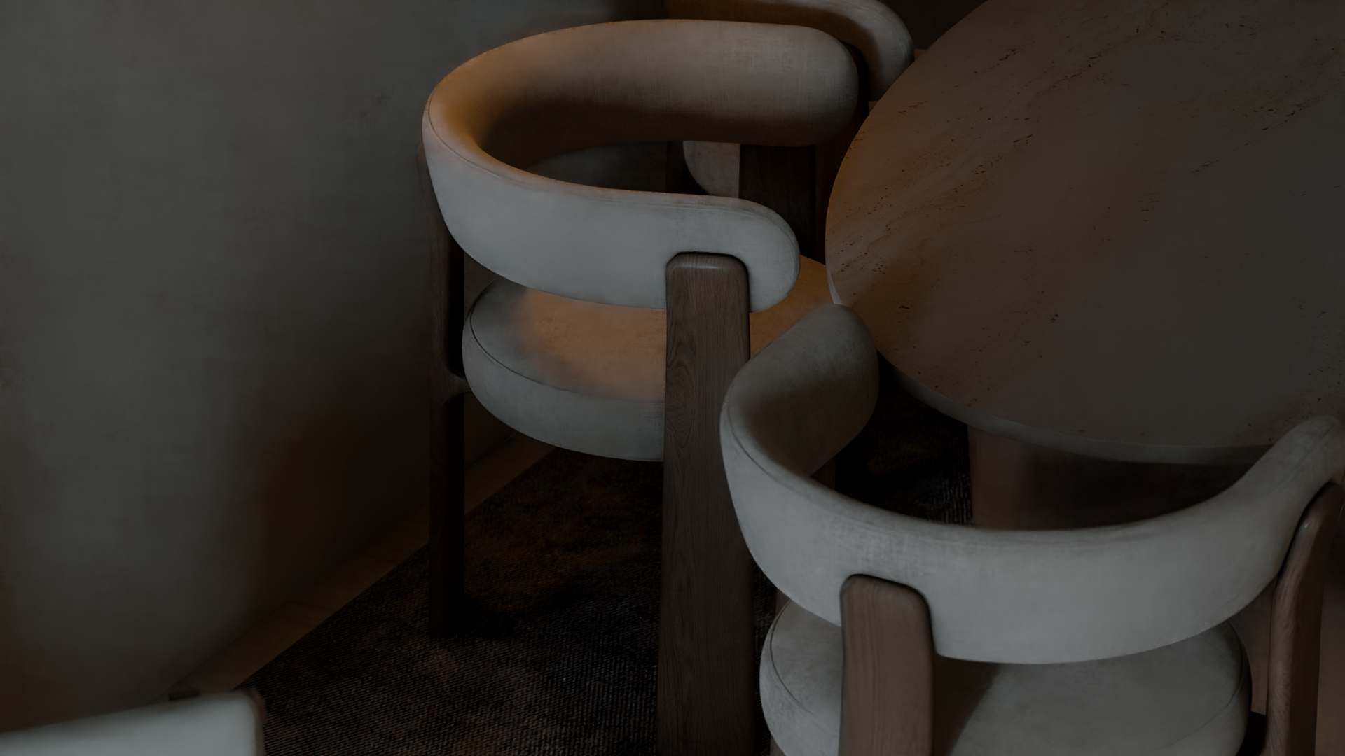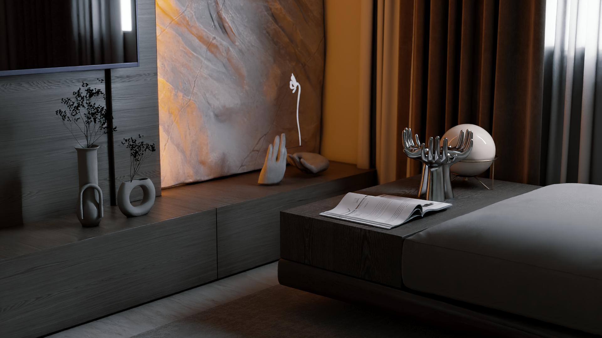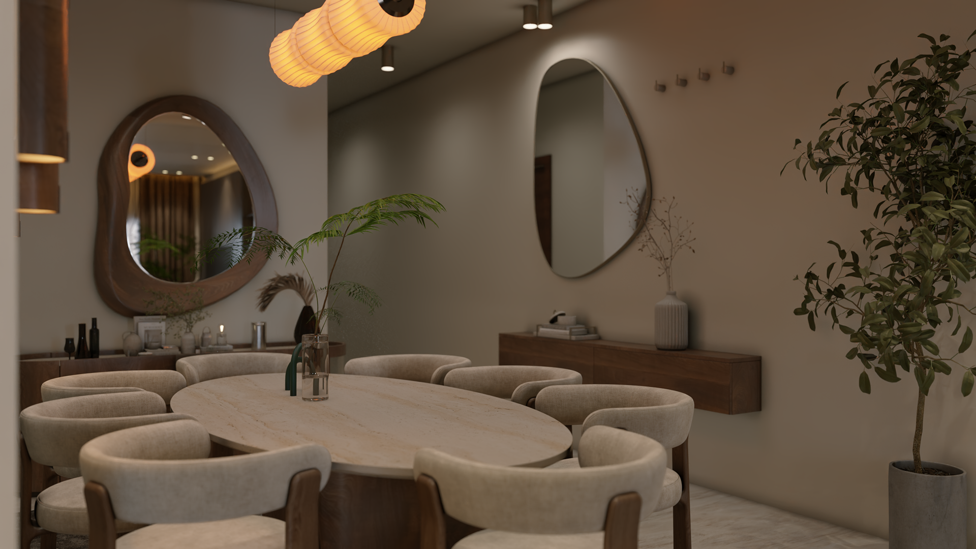 The apartment with just the indirect lights on