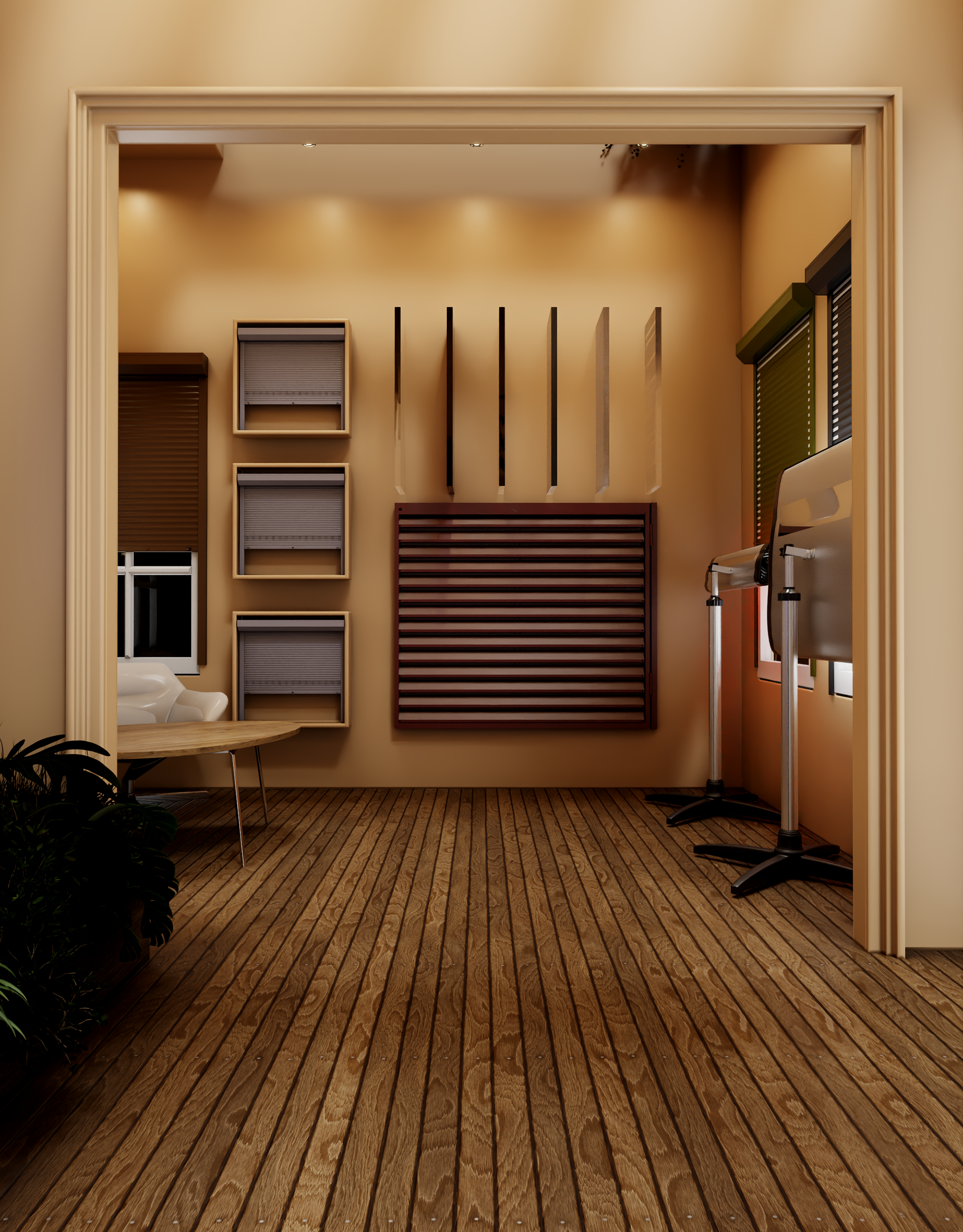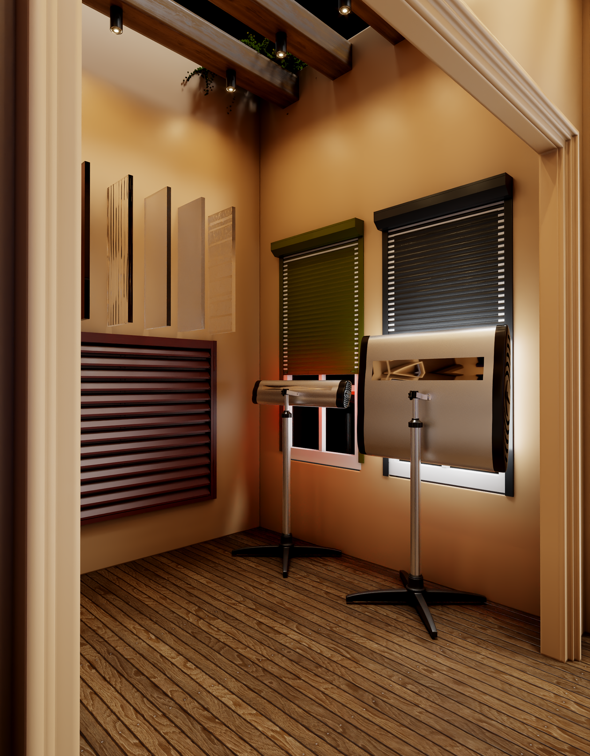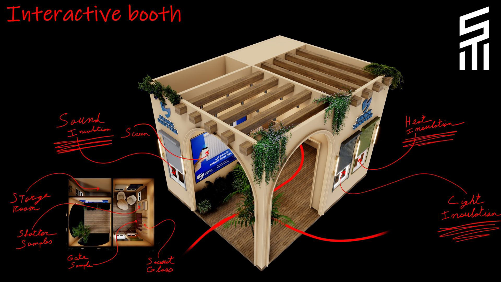 The proposed Interactive Booth is conceived as an architectural experience rather than a conventional exhibition stand. Instead of a typical open booth, the design is developed as a cut-out section of a building façade, complete with a balcony element, allowing visitors to immediately relate the product to a real-life application. This concept places the shutters in their natural context, transforming them from a displayed product into a functional architectural component. Visitors can interact directly with the shutters to experience their key advantages firsthand—demonstrating how they effectively control heat, regulate light, and reduce sound. By engaging with the booth, users gain a tangible understanding of the performance and quality of the system rather than simply viewing it as a sample. The balcony and façade composition add depth and realism to the booth, creating a strong visual identity that stands out within the exhibition hall. This immersive approach not only highlights